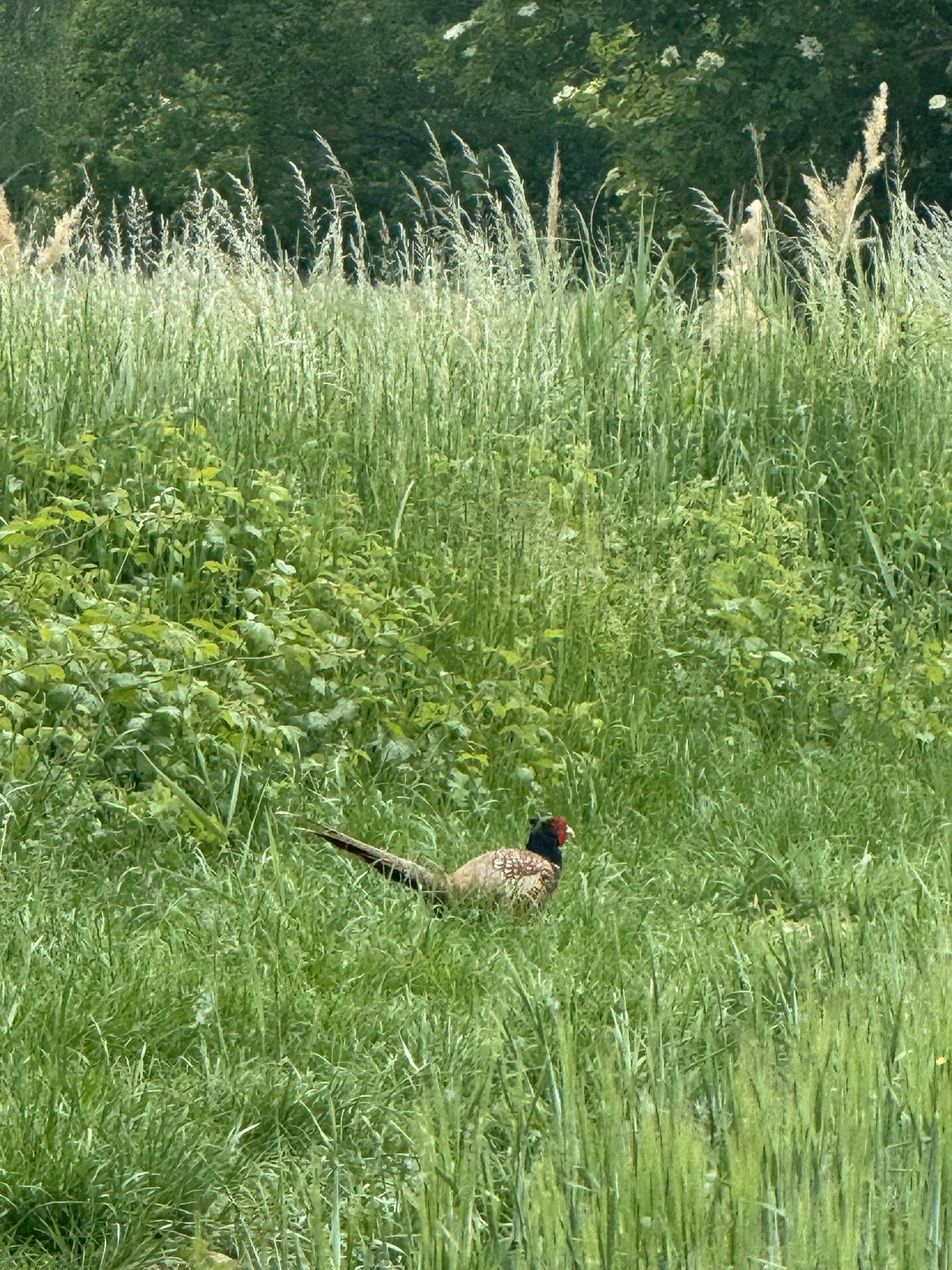 Unsere zwei Baumreihen dort sind jetzt etwas freigestellt und zugänglich gemacht, wir haben aber auch noch reichlich Streifen mit halbhohem Gras und Pflanzen stehen lassen, damit die Tierwelt auch noch was zum Unterschlüpfen und zum Futtern hat. Auch den – sonst in Naturschützerkreisen nicht gut gelittenen – Kirschlorbeerstrauch haben wir stehen lassen; Manfred hat unter seinen Zweigen eine einladende Höhle für Tiere entdeckt (wer da wohl immer hinkommt?). Ich finde ja sowieso, dass man mit den sogenannten „invasiven Arten“ nicht so gnadenlos umgehen sollte.