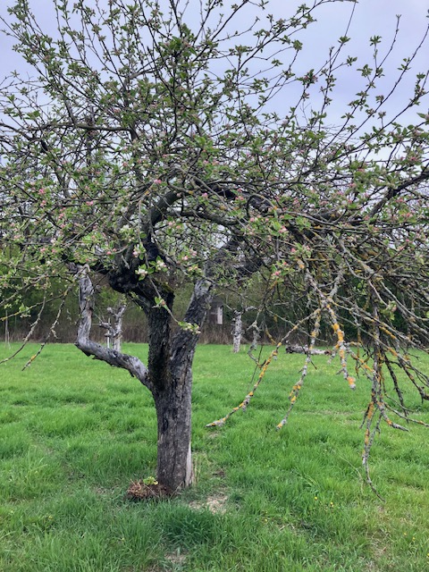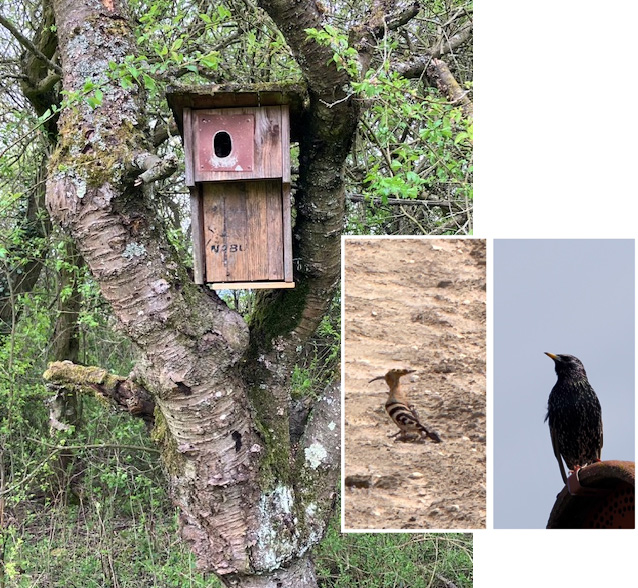 Inzwischen ist der Wiedehopfkasten, in dem Stare wohnen, wieder repariert, und die Apfelbäume auf der Wiese fangen an zu blühen: