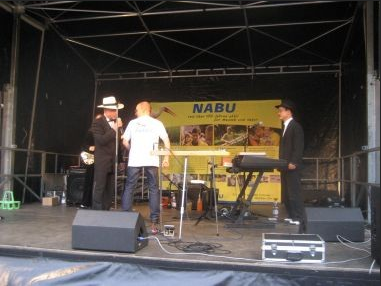 „Hinterher soll jeder Frankenthaler wissen, dass es den NABU hier in der Stadt gibt und was er macht“, so die Vision von Manfred Becker, dem Vorsitzenden der NABU-Gruppe Frankenthal, als man gemeinsam mit dem NABU Beraterteam im letzten Jahr überlegte, wie man vor Ort neue Aktive gewinnen könnte. Die Kulturtage als größte Veranstaltung in Frankenthal boten den richtigen Rahmen für diese Mission. Monika Kröber, die zweite Vorsitzende, hatte die Idee, wie man dort in positiver Weise Aufsehen erregen könnte: Durch das Engagement keiner geringeren Band als den „Uffgschdummbd“, die in Pfälzer Mundart beschwingte Bluesstücke vortragen und das Publikum stets mitzureißen wissen. Dank einer großzügigen Spende der Sparkasse Rhein-Haardt wurde dieser Traum auch Wirklichkeit. Am Freitagabend verzogen sich Wind und Regen rechtzeitig, um den Brüdern Hauck und Sohn Dennis einen gut besuchten Auftritt zu bescheren. Landesvorsitzender Siegfried Schuch war eigens aus Nierstein angereist, um dieses „Event“ nicht zu verpassen. Zur Einstimmung führte Conny Hauck, Sänger und Frontmann der Band, gemeinsam mit Manfred Becker eine spontane Slapstick-Comedy rund um das Thema „Nistkästen“ auf – natürlich „uff Pälzisch“. Hauck entschied sich eindeutig für die Mehlschwalbe als sympathischste Vogelart, da sie pflegeleicht ist und im Gegensatz zu Meise, Kleiber und Hausrotschwanz ihre Nisthilfe selbst reinigt.