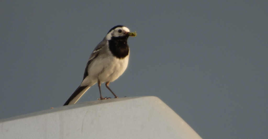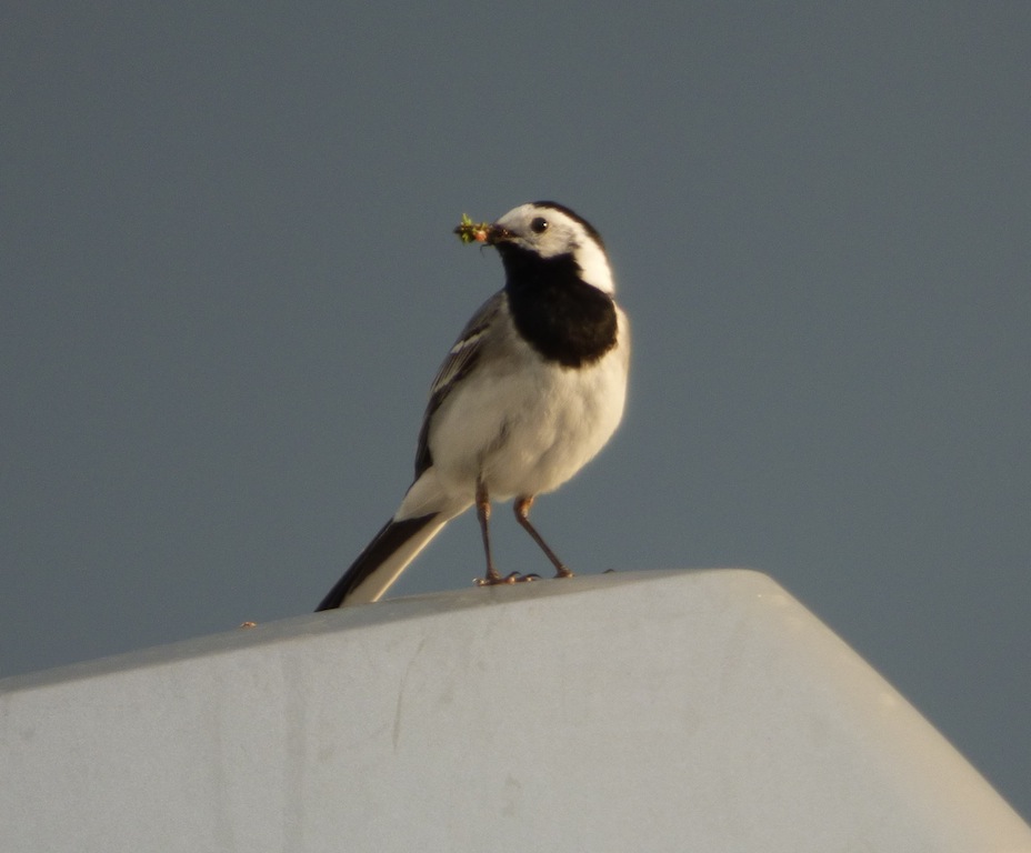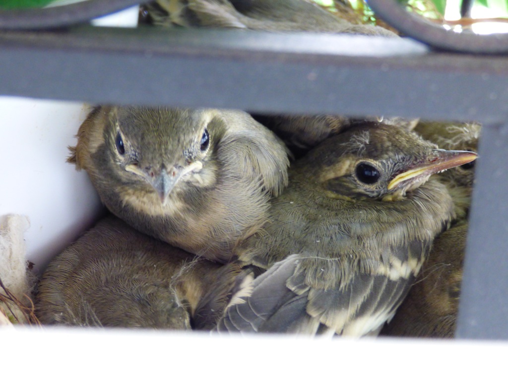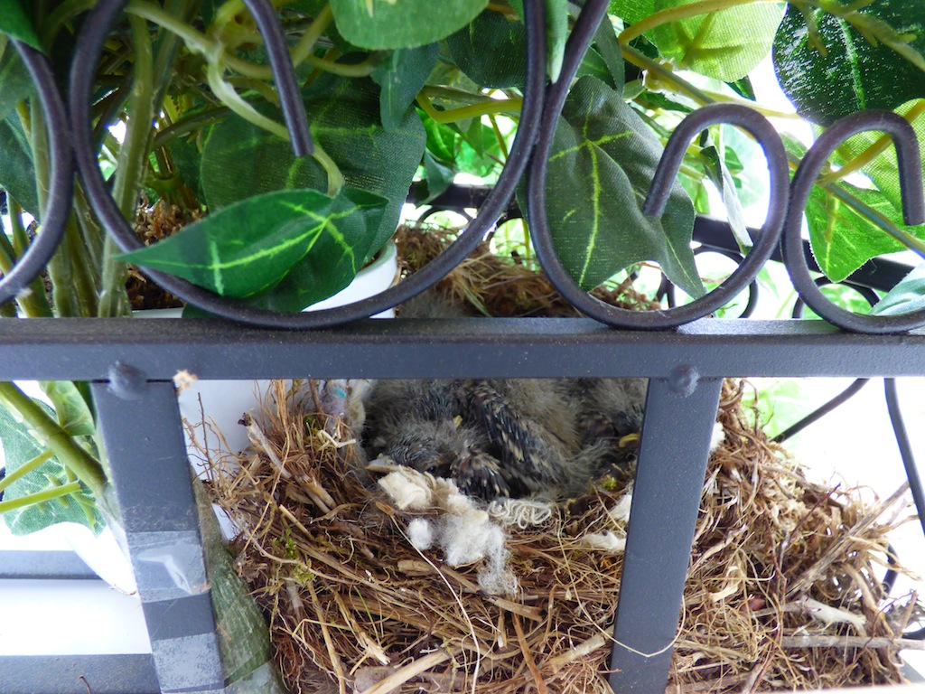 Sehr oft bewegten sich die Bachstelzen auf den Dachflächen, wobei sie anscheinend besonders gerne die Regenrinne nach Insekten absuchten und dort auch fündig wurden. Wegen ihrer Vorliebe für Dachflächen ernannte ich die Bachstelzen kurzerhand zu Dachstelzen. Das nahmen sie auch ohne Protest hin. Mitte Mai wurde der Balkon unserer Nachbarin häufig von den Dachstelzen angeflogen. Die Nachbarin wurde nun gebeten den Balkon möglichst wenig zu nutzen um eine eventuelle Brut nicht zu gefährden. Sie meinte jedoch: „Auf ihrem Balkon gäbe es kein Vogelnest“. Schließlich, nach eifrigem Suchen entdeckte ich, hinter einem eisernem Blumengestell, die gutversteckte Kinderstube in der sich sechs Küken aneinander schmiegten.