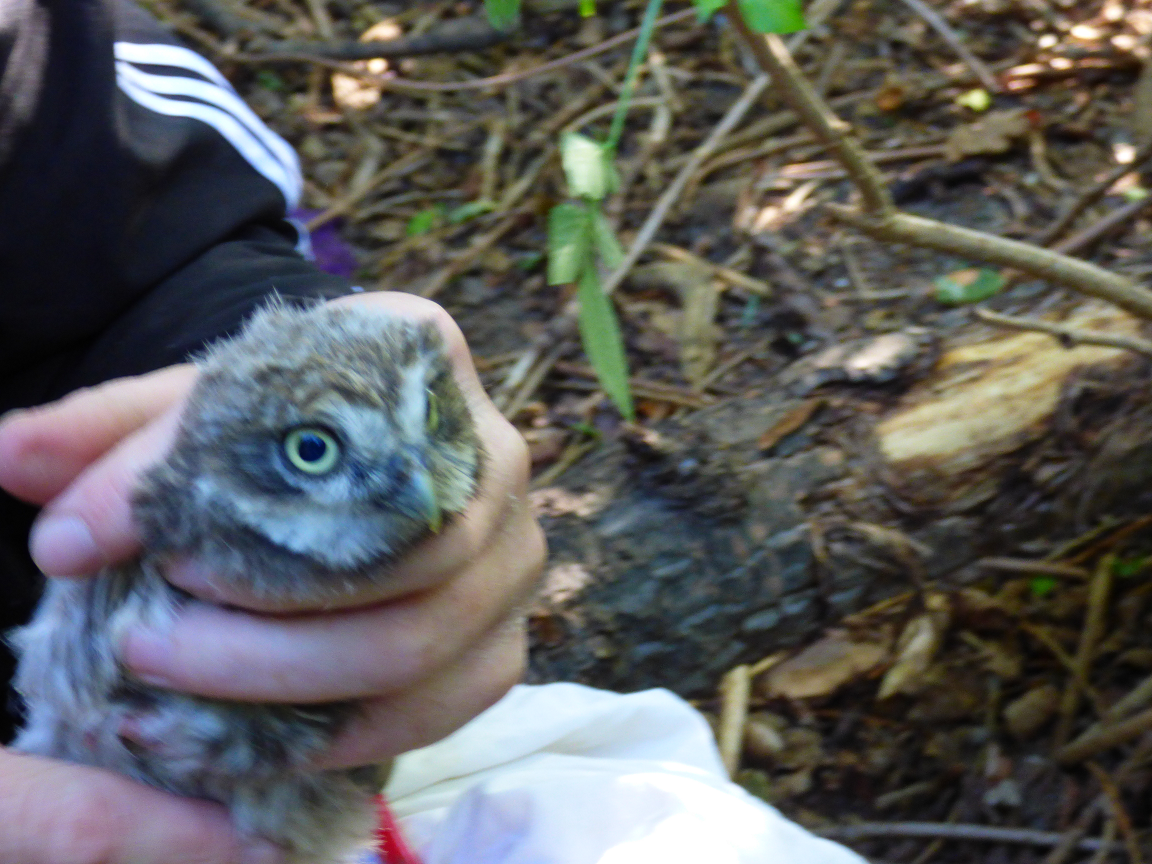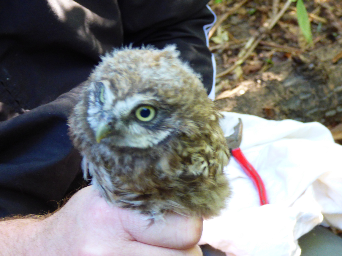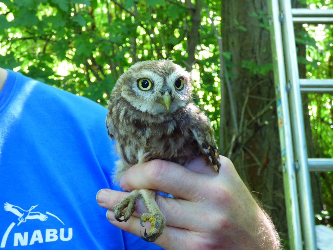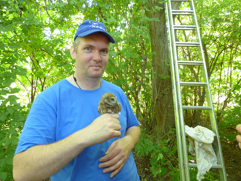 Schwierig gestaltete sich die Suche nach geeigneten einzeln stehenden Bäumen. Dabei bemerkten wir, wie ausgeräumt damals unsere Feldflur war. Des weiteren protestierte der für unseren Baumbestand zuständige städtische Angestellte gegen das Anbringen der Brutröhren heftig und ließ sich erst nach langer Diskussion überzeugen, die Anbringung zu dulden. In kalten klaren Februar- und Märznächten suchten und fanden wir endlich ein einziges Steinkauzpaar. Am Studernheimer Sportplatz bewohnte es offenbar eine natürliche Baumhöhle und zog dort auch einige Jahre Nachwuchs auf. Es verspürte keinerlei Lust, auf unsere Wohnungsangebote einzugehen und in eine der komfortablen Röhren umzuziehen. Aus uns unbekannten Gründen verschwand dieses Steinkauzpaar auf Nimmerwiedersehen. So mussten wir jahrelang vergeblich auf ein neues Brutpaar warten. In jedem Jahr stand das Reinigen der Brutröhren an. Denn fast alle wurden Jahr für Jahr von Staren besetzt, die sich über unser Angebot an Brutraum begeistert zeigten, dabei aber fast den ganzen Hohlraum mit Zweigen, Blättern, Grashalmen und Stroh ausfüllten. Zwar fanden wir auch hin und wieder in den Röhren Federn, Speiballen und Kot von Steinkäuzen, ja sogar einzelne Altvögel fanden wir 2x, aber ein Brutnachweis gelang uns nie. Mittlerweile können wir diese gefährliche Schwerarbeit mit langen Leitern wegen unseres Alters nicht mehr ausführen. So begnügten wir uns mit der Kontrolle und Reinigung einiger leicht erreichbarer Brutröhren. Nun haben Heiko Weisgerber und Jörn Weiß diese Aufgabe übernommen, wobei ich mich bereit erklärt habe, den Leitertransport zu übernehmen. Am Sonntag dem 15.06.2014 starteten wir zu dritt unsere erste Tour und konnten auf Anhieb 2 Brutnachweise des Steinkauzes erbringen.