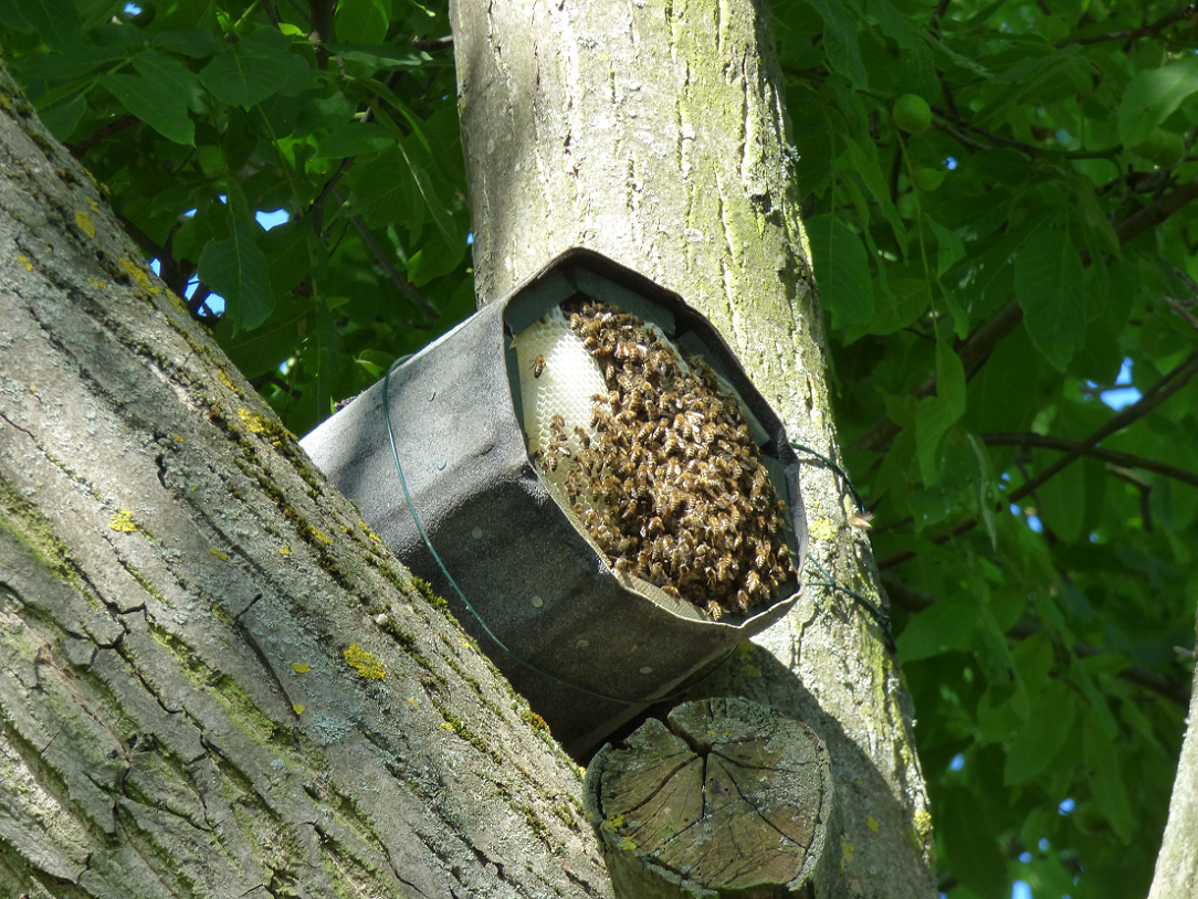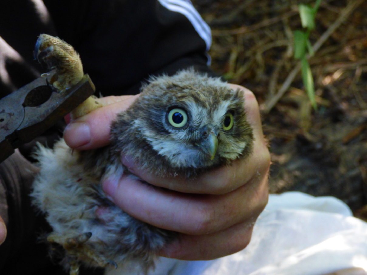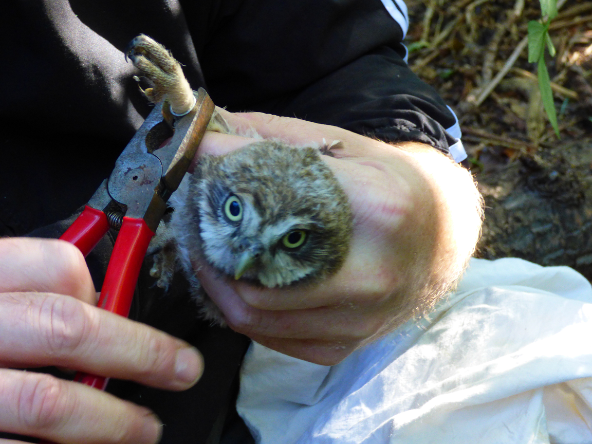 Schwierig gestaltete sich die Suche nach geeigneten einzeln stehenden Bäumen. Dabei bemerkten wir, wie ausgeräumt damals unsere Feldflur war. Des weiteren protestierte der für unseren Baumbestand zuständige städtische Angestellte gegen das Anbringen der Brutröhren heftig und ließ sich erst nach langer Diskussion überzeugen, die Anbringung zu dulden. In kalten klaren Februar- und Märznächten suchten und fanden wir endlich ein einziges Steinkauzpaar. Am Studernheimer Sportplatz bewohnte es offenbar eine natürliche Baumhöhle und zog dort auch einige Jahre Nachwuchs auf. Es verspürte keinerlei Lust, auf unsere Wohnungsangebote einzugehen und in eine der komfortablen Röhren umzuziehen. Aus uns unbekannten Gründen verschwand dieses Steinkauzpaar auf Nimmerwiedersehen. So mussten wir jahrelang vergeblich auf ein neues Brutpaar warten. In jedem Jahr stand das Reinigen der Brutröhren an. Denn fast alle wurden Jahr für Jahr von Staren besetzt, die sich über unser Angebot an Brutraum begeistert zeigten, dabei aber fast den ganzen Hohlraum mit Zweigen, Blättern, Grashalmen und Stroh ausfüllten. Zwar fanden wir auch hin und wieder in den Röhren Federn, Speiballen und Kot von Steinkäuzen, ja sogar einzelne Altvögel fanden wir 2x, aber ein Brutnachweis gelang uns nie. Mittlerweile können wir diese gefährliche Schwerarbeit mit langen Leitern wegen unseres Alters nicht mehr ausführen. So begnügten wir uns mit der Kontrolle und Reinigung einiger leicht erreichbarer Brutröhren. Nun haben Heiko Weisgerber und Jörn Weiß diese Aufgabe übernommen, wobei ich mich bereit erklärt habe, den Leitertransport zu übernehmen. Am Sonntag dem 15.06.2014 starteten wir zu dritt unsere erste Tour und konnten auf Anhieb 2 Brutnachweise des Steinkauzes erbringen.
