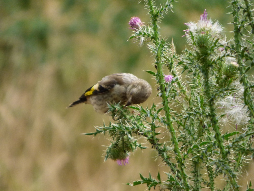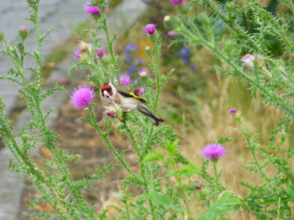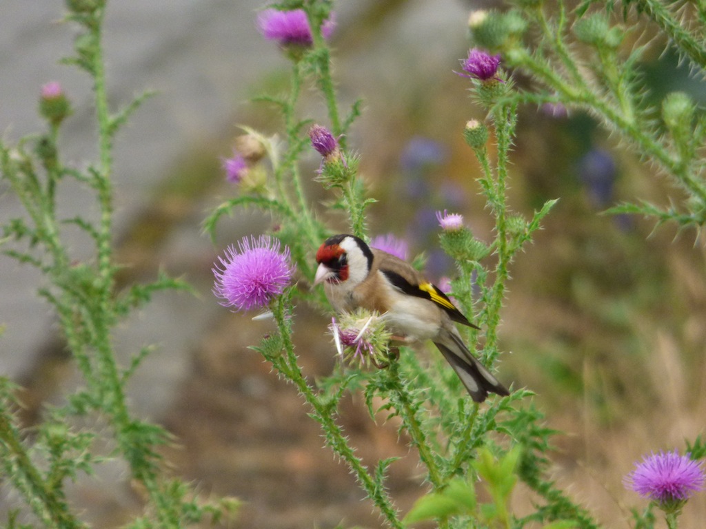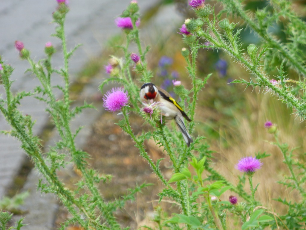 Zu meiner Freude stellen sich auch wieder Schmetterlinge, Hummeln, Bienen und Singvögel ein. So konnte ich mich heute an diesen Distelfinken erfreuen. Warum wohl heißen diese hübschen, bunten Vögelchen Distelfinken? Die Finken ließen sich jedenfalls die Samen der von so vielen Menschen verfemten Disteln schmecken. Gönnen wir doch endlich der Natur einige Freiflächen in unserer Stadt.