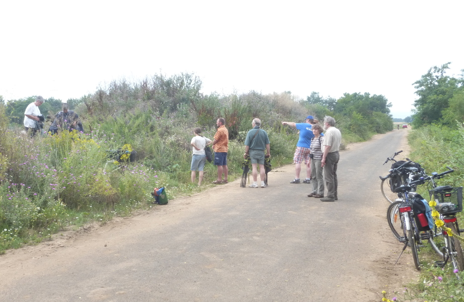 Über vierzig Personen hatten sich im Vorfeld zu dieser Exkursion angemeldet um mit dem Fahrrad von Frankenthal aus zu den Bienenfressern nach Gerolsheim zu fahren. Nach den Erfahrungen der letzten Exkursionen schwahnte mir schon Böses als ich zum Treffpunkt am AEG radelte und dunkle Wolken am Himmel zu sehen waren. Bloß nicht wieder eine Regenveranstaltung …Am Treffpunkt angekommen schienen sich meine Befürchtungen zu bewahren als lediglich zwei Personen vor Ort waren. Nachdem beide dann mit dem Auto bis zum Friedhof in Lambsheim fahren wollten, machte ich mich alleine mit dem Fahrrad auf dem Weg dorthin. Dunkle Regenwolken am Haardtrand machten wenig Hoffnung auf Sonnenschein aber ich dachte mir „schlimmer als am 01.Mai kann es nicht werden“. Am Friedhof in Lambsheim angekommen war ich mehr als erleichtert das doch einige Leute den Weg zu diesem zweiten Treffpunkt gefunden haben, so das etwas mehr als 20 Personen sich mit dem Rad auf machten, die Bienenfresser zu beobachten. Zwei Damen aus Marburg sind noch zu erwähnen, welche extra wegen dieser Exkursion diesen doch recht weiten Weg so früh am Sonntag Morgen auf sich genommen haben. Auf dem rund zehn Minuten Weg zu den Gruben sahen wir schon erste Bienenfresser bei der Jagd, so das das Ziel der Exkursion schon nach kurzer Zeit erreicht war 🙂