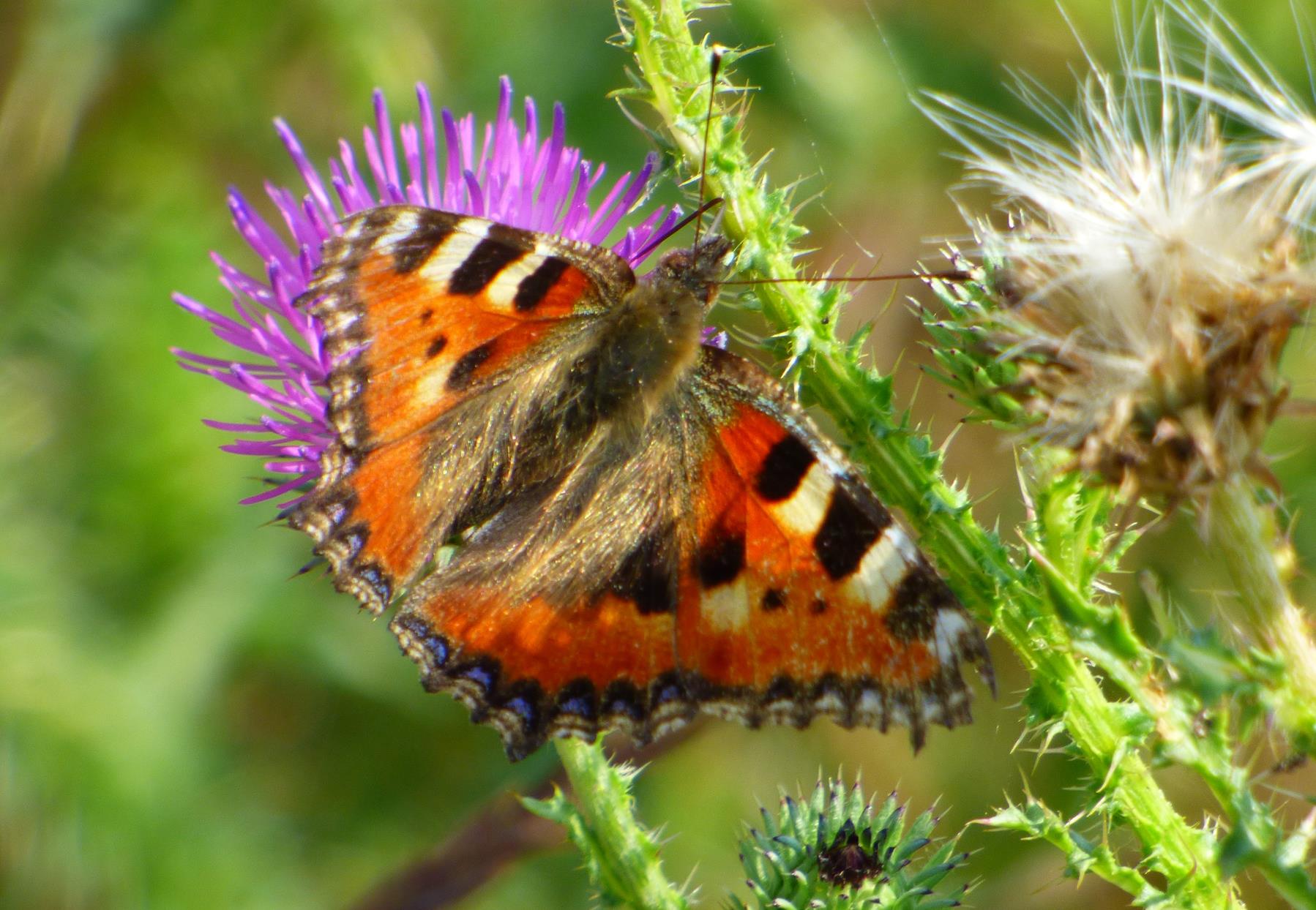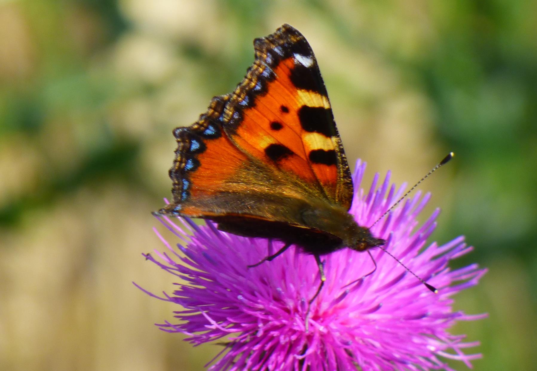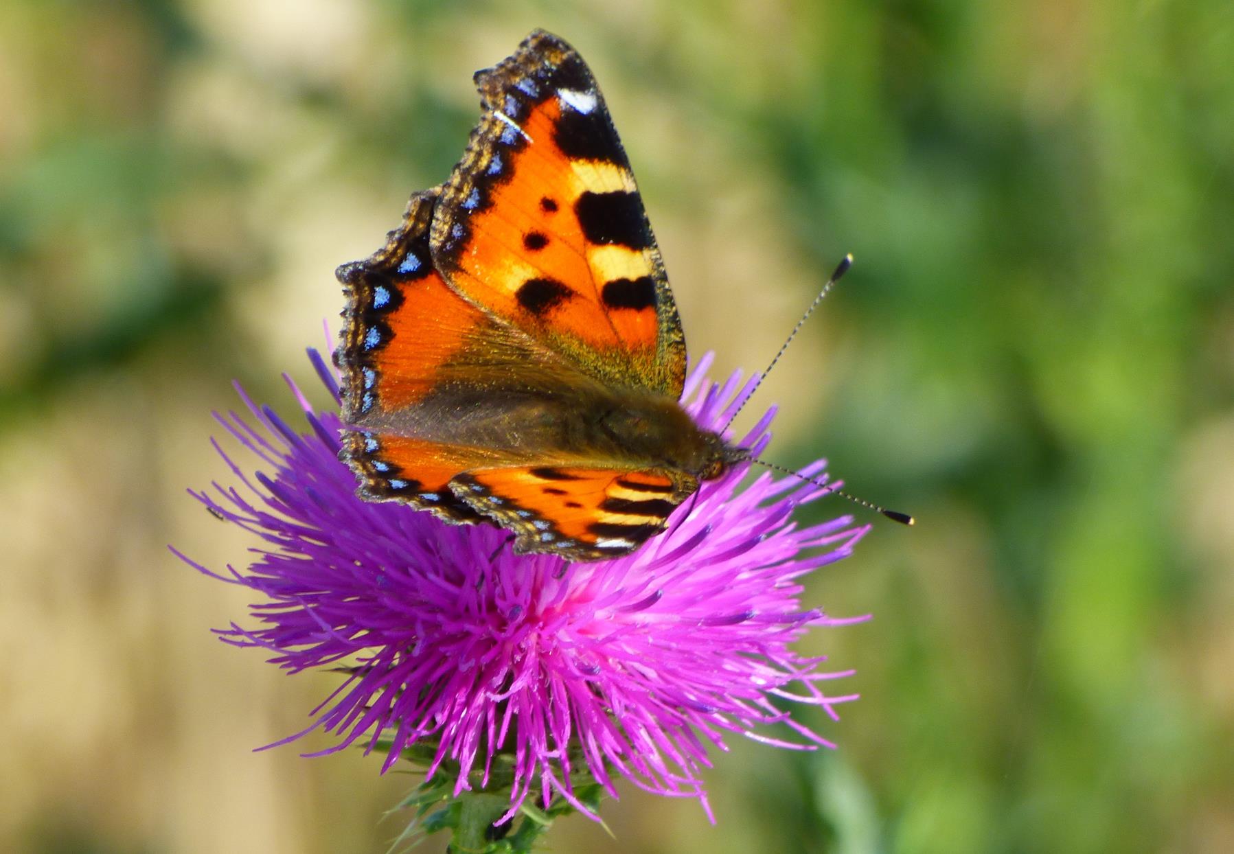 Vor unserem Haus befindet sich eine Wiese oder Brachfläche, und auf diesem Gelände wachsen sehr viele Disteln. Diese Disteln sind für einige unserer Nachbarn ein Ärgernis. Sie meinen, die Fläche müsse öfter gemäht werden. Als Naturbeobachter habe ich aber meine Freude an den vielen Tieren, die die Disteln aufsuchen, um sie als Nahrungsquelle zu nutzen. Auch der Kleine Fuchs kann den lockenden Distelblüten nicht widerstehen und findet sich des Öfteren auf diesem Gelände ein. Als Kulturfolger ist dieser Schmetterling nicht sehr wählerisch und daher selbst im innerstädtischen Häusermeer anzutreffen, sofern er dort Blüten auf Balkonen oder in Vorgärten findet. Er überwintert sogar in Gebäuden und ist im Frühling als einer der ersten Schmetterlinge zu sehen. Seine Eier legt der Kleine Fuchs Häufchen weise ausschließlich an Brennnesseln ab. Wenn die Raupen aus den Eiern schlüpfen, ernähren sie sich von den Blättern dieser Pflanzen. Daran sollte man denken, bevor man die Nesseln mit Hacke oder gar chemischen Unkrautvernichtungsmitteln beseitigen will, denn wo keine Brennnesseln wachsen, kann auch kein Kleiner Fuchs groß werden.