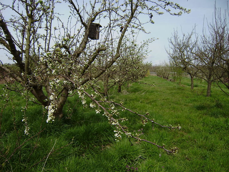 Wir machten eine Inspektionstour über Pflaumen- und Apfelwiese, um zu sehen wie weit die Blüte dort ist. Auf der Pflaumenwiese fangen die Blüten der Pflaumenbäume an, sich zu öffnen – nächstes Wochenende wird bei den Temperaturen die Vollblüte da sein.