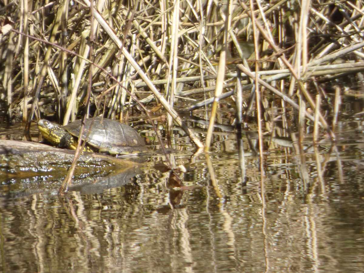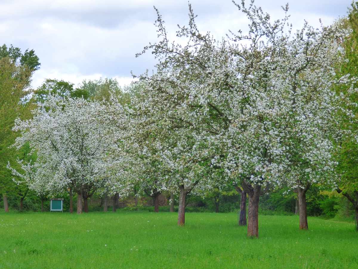 Schon auf dem Weg entlang des Gartenlokals vom Fischerverein entzücken uns die melodischen Flötentöne des Pfingstvogels. Aber so sehr wir auch unsere Augen durch das frische Grün der Bäume schweifen lassen, den Pirol können wir trotz seines auffälligen Federkleides nicht entdecken. Eine Misteldrossel hingegen, die doch viel unauffälliger gekleidet ist, entgeht unseren Blicken und dem Kameraobjektiv nicht. Unüberhörbar ist das Konzert, dass mehrere Nachtigallen veranstalten. Am Scherrschen Weiher können wir die Europäische Sumpfschildkröte bei ihrem Sonnenbad beobachten. Die Blüten der Apfelbäume ziehen viele fleißige Bienen und Hummeln zur Honigernte an.