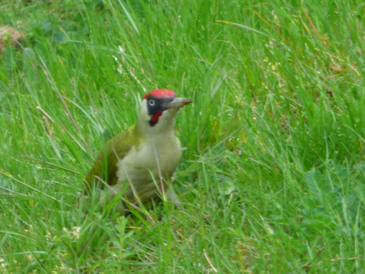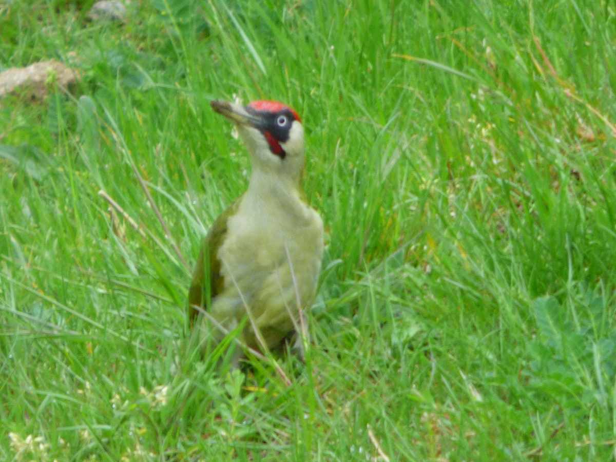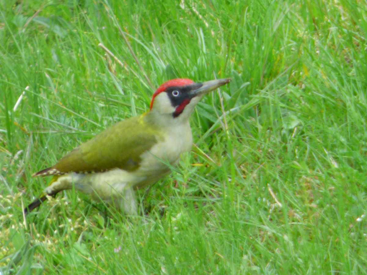 Heute am Nachmittag, ein leichter Nieselregen fällt. Gertrud steht auf unserem Balkon und schaut, ob ein Sonntagsspaziergang lohnenswert ist. „Komm schnell, ein Grünspecht ist soeben angeflogen“ ruft sie. Flink greife ich zum stets bereit liegenden Fernglas. Auf der Rasenfläche gegenüber unserem Haus ist im mittlerweile doch schon recht hohen Gras der grüne Specht fast nicht zu sehen. Hier stochert der Nahrungsspezialist anscheinend nach Ameisen. Nur wenn er den Kopf hebt, um sich gegen eventuelle Gefahren zu sichern, ist er deutlich zu erkennen. Es bleibt mir noch genügend Zeit, die Kamera zu richten und den Ameisenjäger abzulichten. Der rote Fleck in seiner schwarzen Gesichtsmaske weist in als männlichen Grünspecht aus. Im Jahr 2014 wurde der Grünspecht zum Vogel des Jahres gewählt. Er gehört zu den wenigen Vogelarten, deren Bestand sich in den letzten Jahren wieder erholen konnte. Das liegt wahrscheinlich daran, dass er sich den innerstädtischen Bereich mit seinen Parkanlagen, Friedhöfen und Gärten als neuen Lebensraum erschlossen hat.