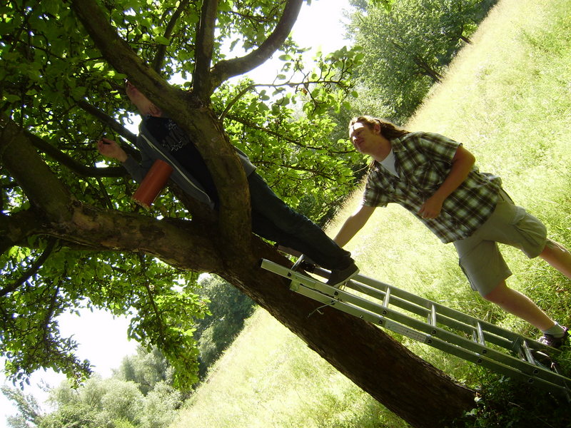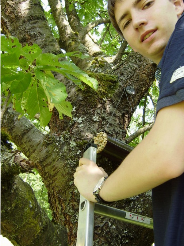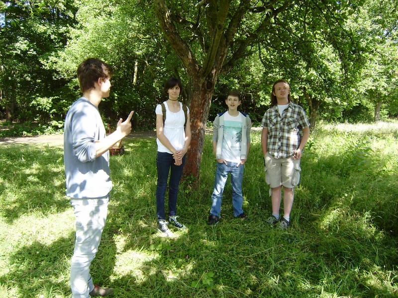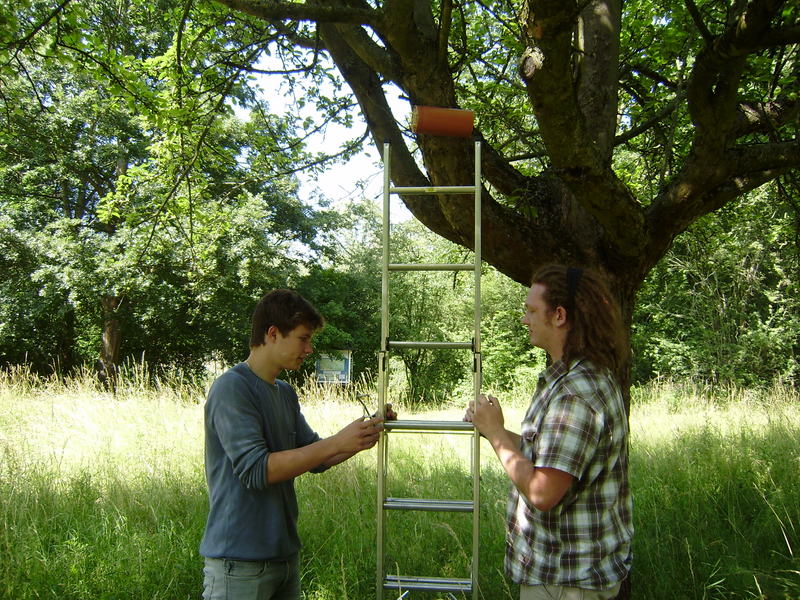 Bei der heutigen NAJU-Stunde haben die Jugendlichen ihre selbstgebauten Nisthilfen für Hautflügler in die Bäume auf der Streuobstwiese im Kleinen Wald aufgehängt.