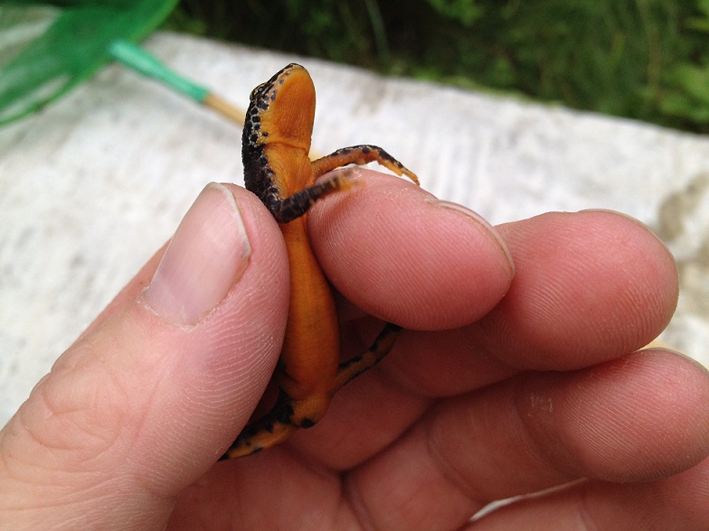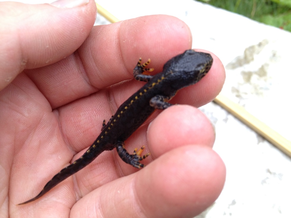 Vor ein paar Tagen sah ich in meinem kleinen Gartenteich einen mir unbekannten Molch schwimmen. Zusammen mit Reinhard habe ich ihn dann heute kurz seinem gewählten Umfeld entnommen um ihn zu identifizieren. Es war ein hier selten vorkommender BERGMOLCH (Triturus alpestris).