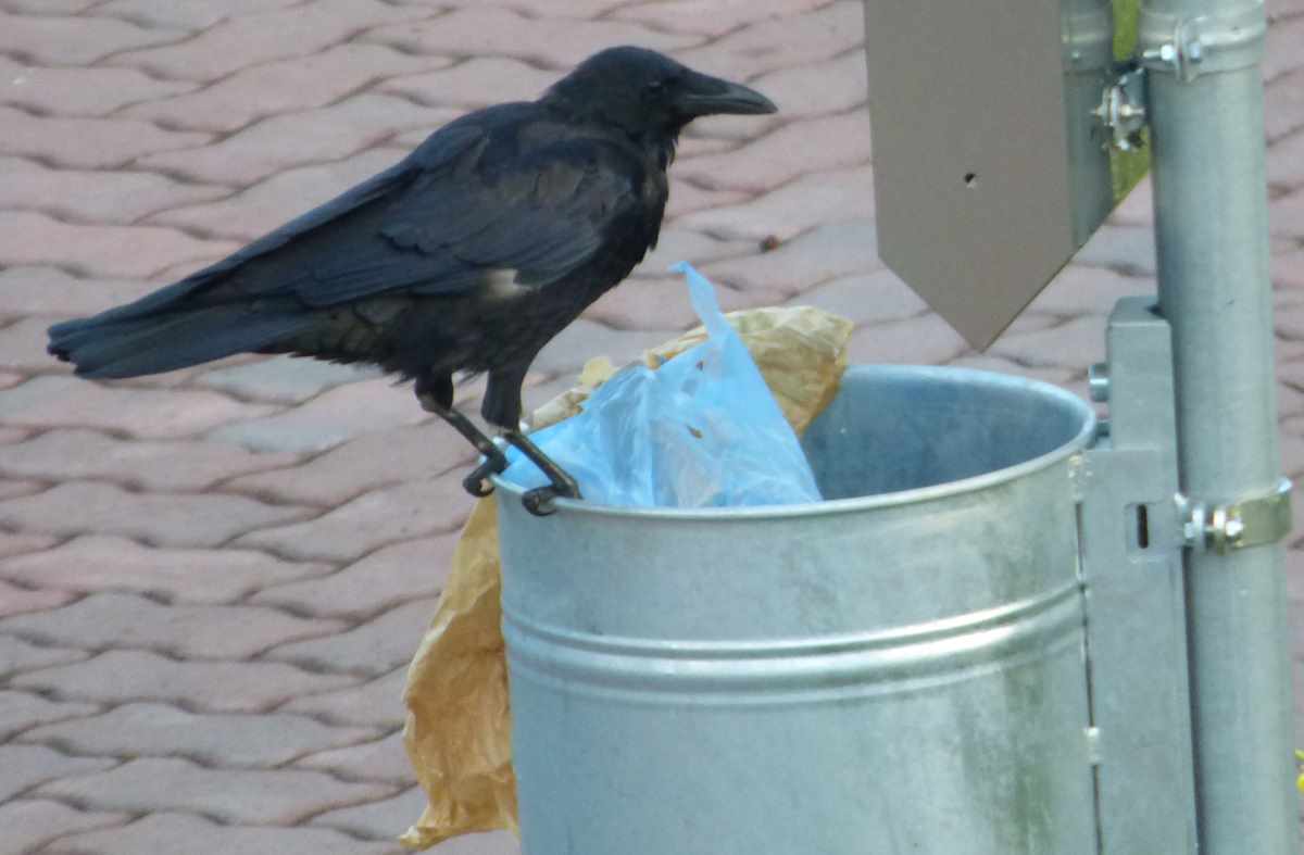 Eines Tages konnte ich endlich einen schwarz gekleideten Übeltäter auf frischer Tat ertappen, als er Abfall aus dem Müllbehälter holte und auf Gehweg und Rasenfläche verstreute.
