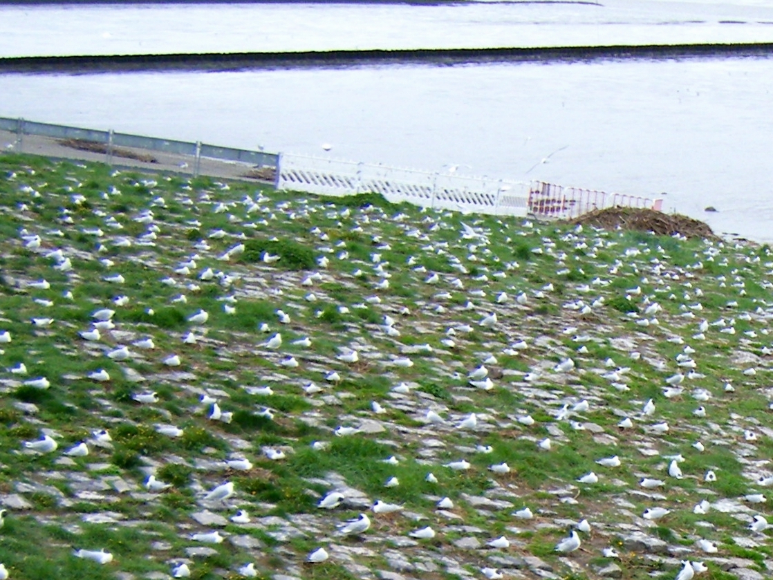 An der Küstenlinie der Nordsee begrüßt mich vor dem riesigen Eidersperrwerk mit großem Geschrei eine brütende Lachmöwen- und Seeschwalbenkolonie.