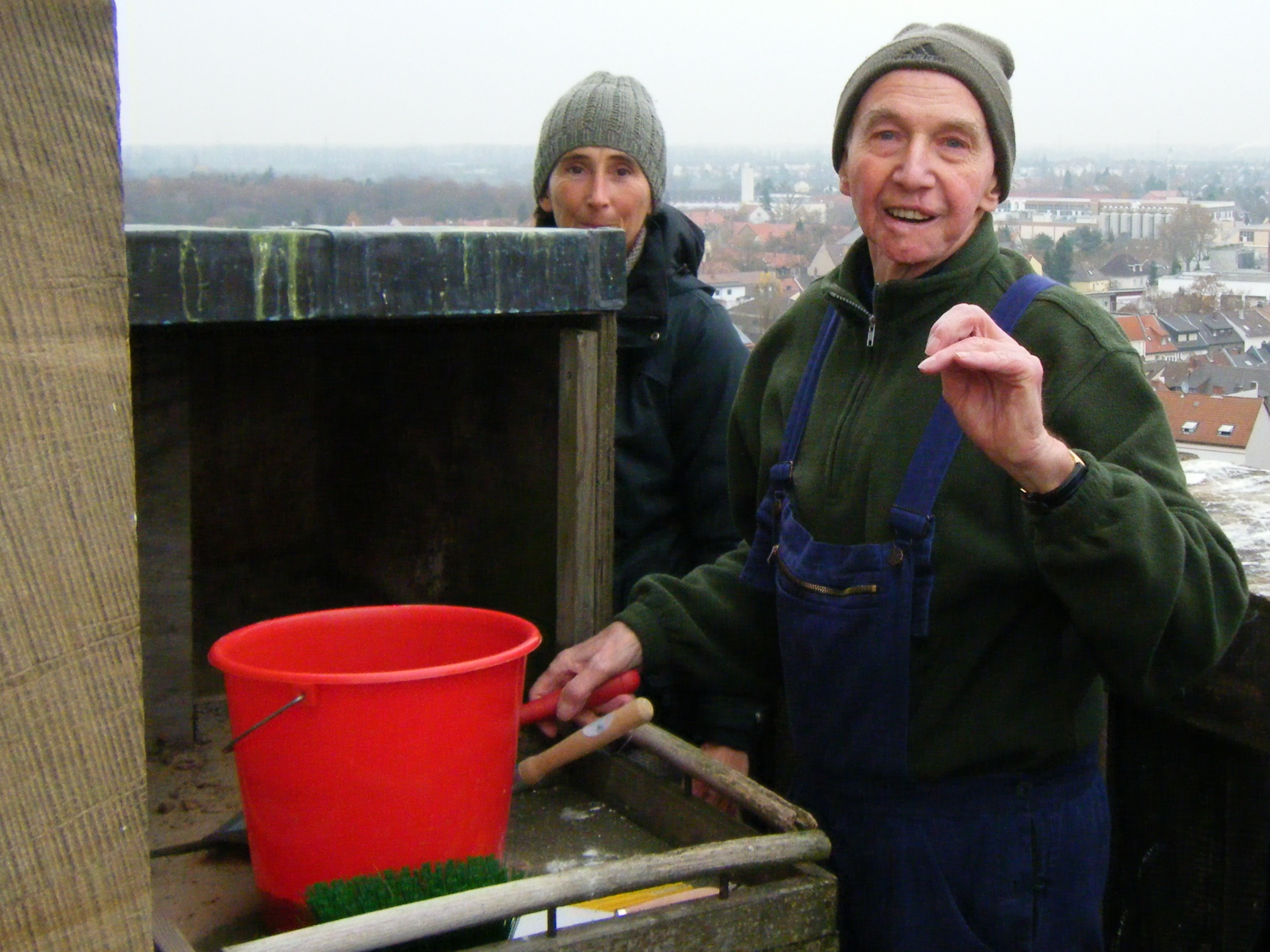 Hoch über den Dächern von Frankenthal hält der Wanderfalke Auschau nach einem geeigneten Brutplatz. Vielleicht gefällt es ihm mal wieder, nach längerer Abwesenheit, auf dem Turm der Zwölf-Apostel-Kirche seinen Nachwuchs groß zu ziehen. Um dafür die Voraussetzungen am Brutkasten zu treffen, sind Moni, Iris, Hermann und Willi am Samstag, den 26.11.2016, auf den Turm, vorbei an den riesigen Glocken, hochgestiegen. Zuerst wird die alte Sandunterlage im Horst entfernt. Nach ordentlichem Säubern kommt der frische Sand, gleichmäßig verteilt, auf den Brutplatz. Die Nabu-Helfer finden in der Umgebung des Horsts Gewölle und Beutereste von Vögeln. Sogar eine Limikole, wahrscheinlich eine Uferschnepfe, ist dabei. Bestimmt hat der Wanderfalke die fliegende Schnepfe in der Nähe des Silbersees im Sturz geschlagen und die Beute hierher geschleppt. Hermann hatte vor kurzer Zeit einen männlichen Wanderfalken, einen Terzel, auf dem Gesims des Turms gesichtet. Nach dem schweren Aufstieg geht es nun erleichtert, wieder vorbei an den Glocken, abwärts zum Ausgang. Nun kann der Wanderfalke kommen.