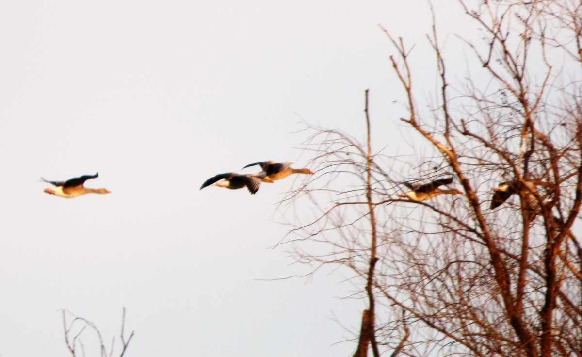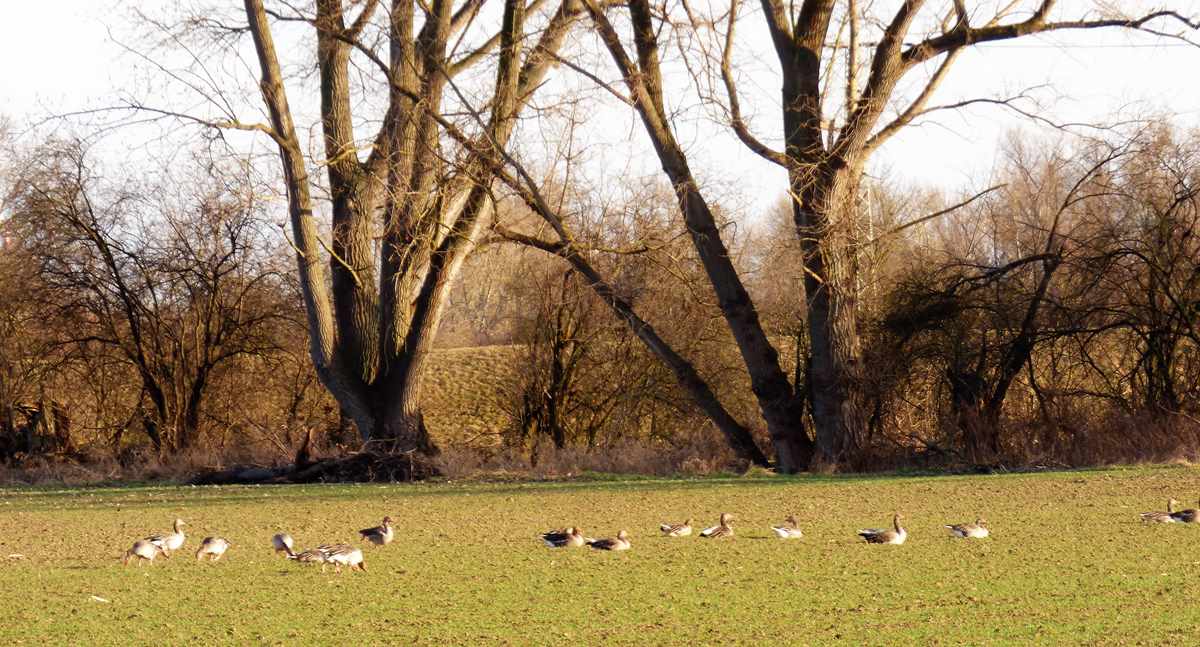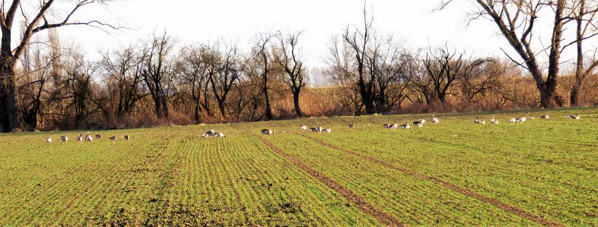 Um die Vorfrühlingssonne zu genießen, wandern Gertrud und ich am Samstag dem 24. Februar auf dem Bobenheimer Binnendamm in Richtung Rhein. Vom Altrhein hören wir das Geschnatter vieler Graugänse. Ab und zu erheben sich von dort kleinere Trupps Gänse und fliegen auf die unweit liegenden Ackerflächen, auf denen die jungen Weizenpflanzen mit frischem Grün zum Schmaus locken. Wer kann es den Gänsen übelnehmen, wenn sie die frischen Kulturpflanzen, die schön angerichtet in Reih und Glied wachsend, den zwischen vergilbten vorjährigen Grasbüscheln spärlich sprießenden Grashalmen vorziehen? Nun, unsere Landwirte sehen das natürlich aus einem anderen Blickwinkel. Schließlich haben die Bauern mit erheblichem Einsatz von Arbeit und Geld die Äcker bestellt, um später eine gute Ernte einzufahren. Wenn nun – wie auf Bild 1 zu sehen- zirka 60 Graugänse auf eine relativ kleine Ackerfläche zum Weiden einfliegen, kann man verstehen, dass der Landwirt sich nicht an diesem Anblick ergötzt. Schließlich können die ungebetenen Gäste erheblichen Schaden an den jungen Pflanzen anrichten und die Ernte erheblich schmälern. In diesem Fall ließ der Landwirt zwei Schreckschüsse los und die Gänse flogen in Panik davon. Ob das Vergrämen von Graugänsen in Rheinland-Pfalz rechtlich zulässig ist, weiß ich nicht. In Nordrhein-Westfalen, wo viele nordische Gänse überwintern, werden Landwirte für Fraßschäden durch Gänse entschädigt. In Rheinland-Pfalz hat Herr Dr. Josef Kreuzinger im Auftrag des Landesamtes für Umweltschutz in Oppenheim über diese Problematik eine Studie erstellt. Auf jeden Fall ist eine Vergrämung, wie wir sie hier gesehen haben,
