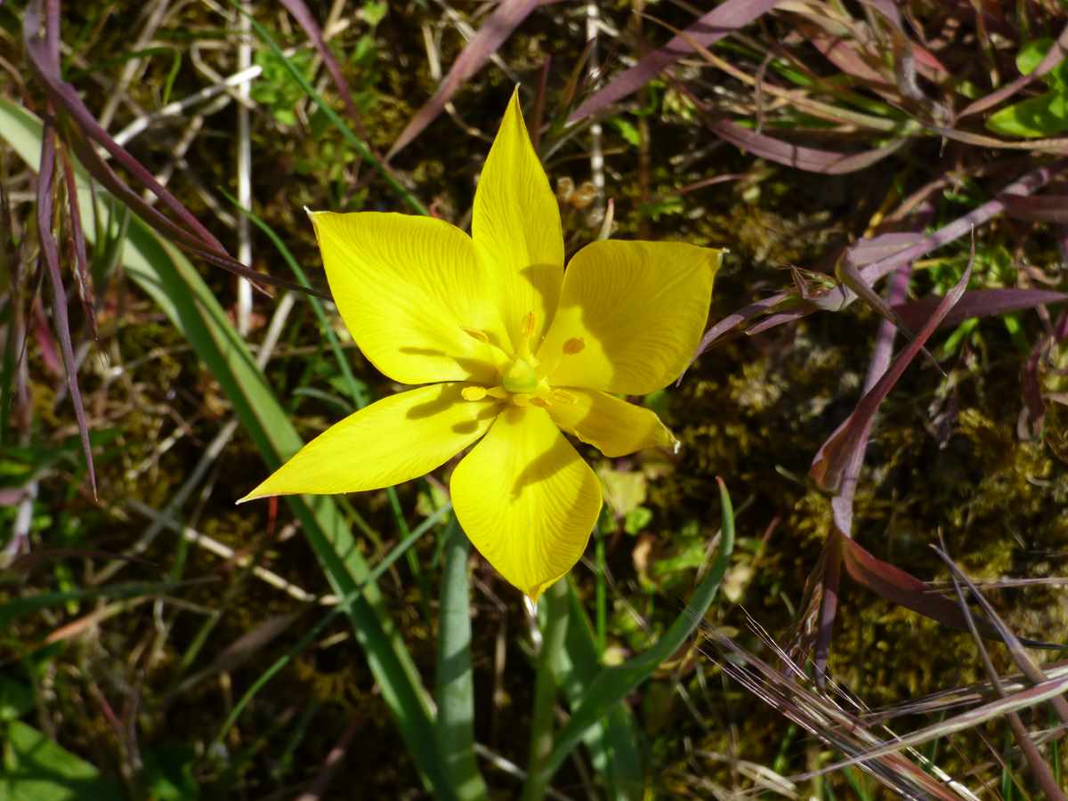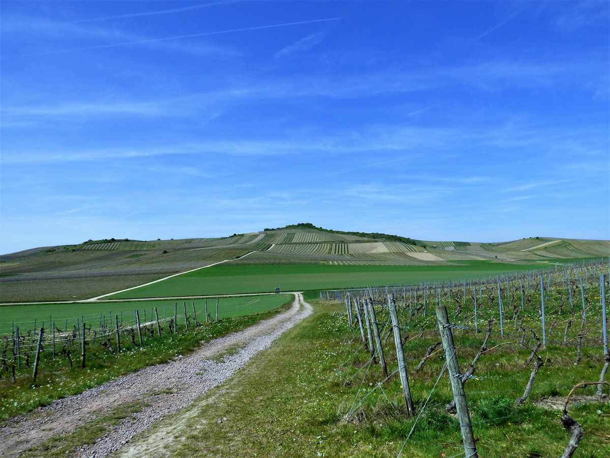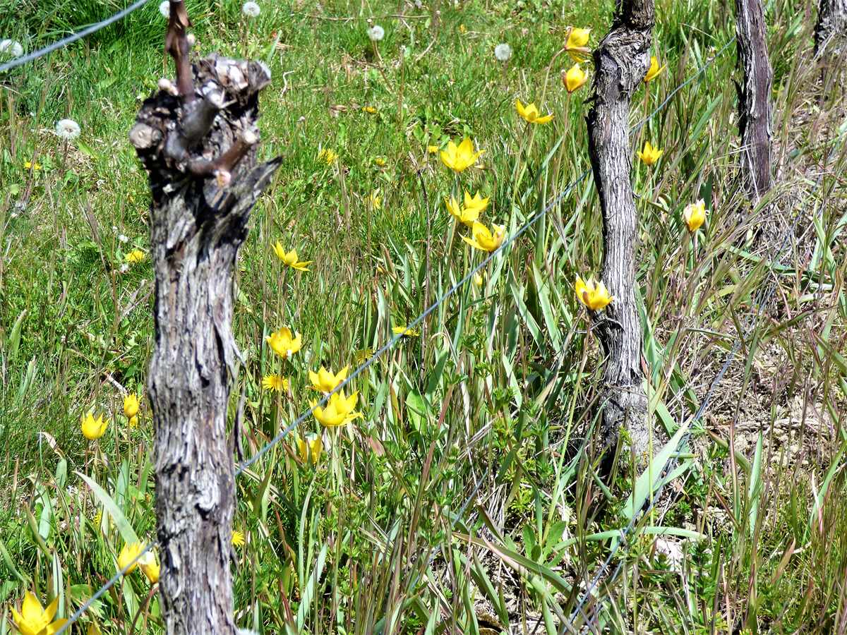 Ein Wegweiser mit der Beschriftung Wildtulpen zeigt uns den Weg. Auf einem Asphaltweg erreichen wir nach 1,5 km eine Informationstafel, auf der wir über die hier wachsenden Wildtulpen lesen: „Wuchsort der Wildtulpe (Tulipa sylvestris L.) Einziger Standort der Wildtulpen in diesem Ausmaß in Deutschland. Ursprung: Südeuropa (Sizilien, Griechenland, Türkei) Sie wurde erst in der 2. Hälfte des 16. Jahrhundert von Bologna nach Mitteleuropa verbreitet. Voraussetzung hier, fettiger, feuchter, steinarmer Lößlehmboden, warmes Klima im Zentrum des rheinhessischen Wärme – und Trockengebietes. Die Tulpe darf nicht ausgegraben oder gepflückt werden“. Nach wenigen Metern den Lieberg aufwärts entdecken wir die erste voll erblühte Tulpe. Auf einem zarten Stängel mit schmalen lanzettischen Blättern sitzt die gelbe Blüte. Ihre sechs Blütenhüllblätter bilden sternförmig einen Kreis. Die Blüte scheint die Sonne und den schwachen Wind zu genießen und schwingt sich wie beseligt im Tanz. Nun erreichen wir eine Weinbauparzelle, in der die Tulpen die dominierenden Beigewächse sind. Der Kontrast zwischen den alten knorrigen graubraunen Rebstöcken und den zarten gelben Tulpen ist einfach märchenhaft, und wir können uns nicht sattsehen. Danach erreichen wir einen schmalen unbewirtschafteten, mit einzelnen Büschen bestandenen Landstreifen, der sich bis zur Bergkuppe hinaufzieht. Hier bilden die Tulpen stellenweise einen dichten gelben Teppich. Verschiedene Hummeln- und Bienenarten summen umher. Hübsche Aurorafalter fechten Revierkämpfe aus. Am Himmel kreisen Mäusebussarde und Turmfalken. Bevor wir den Rückweg antreten, ruhen wir uns auf einer Bank etwas aus, blicken zum nahen Petersberg und genießen die wärmenden Sonnenstrahlen.