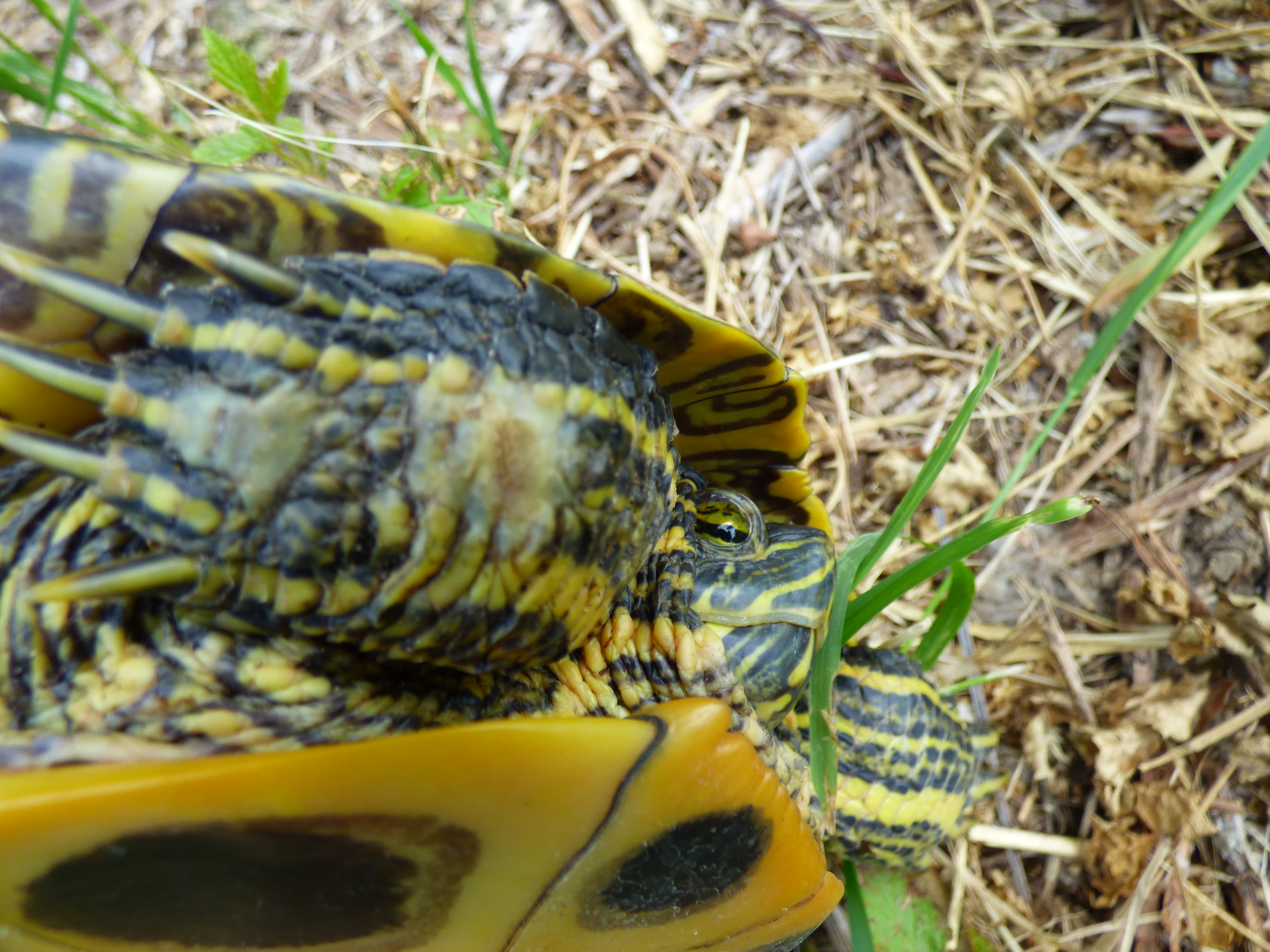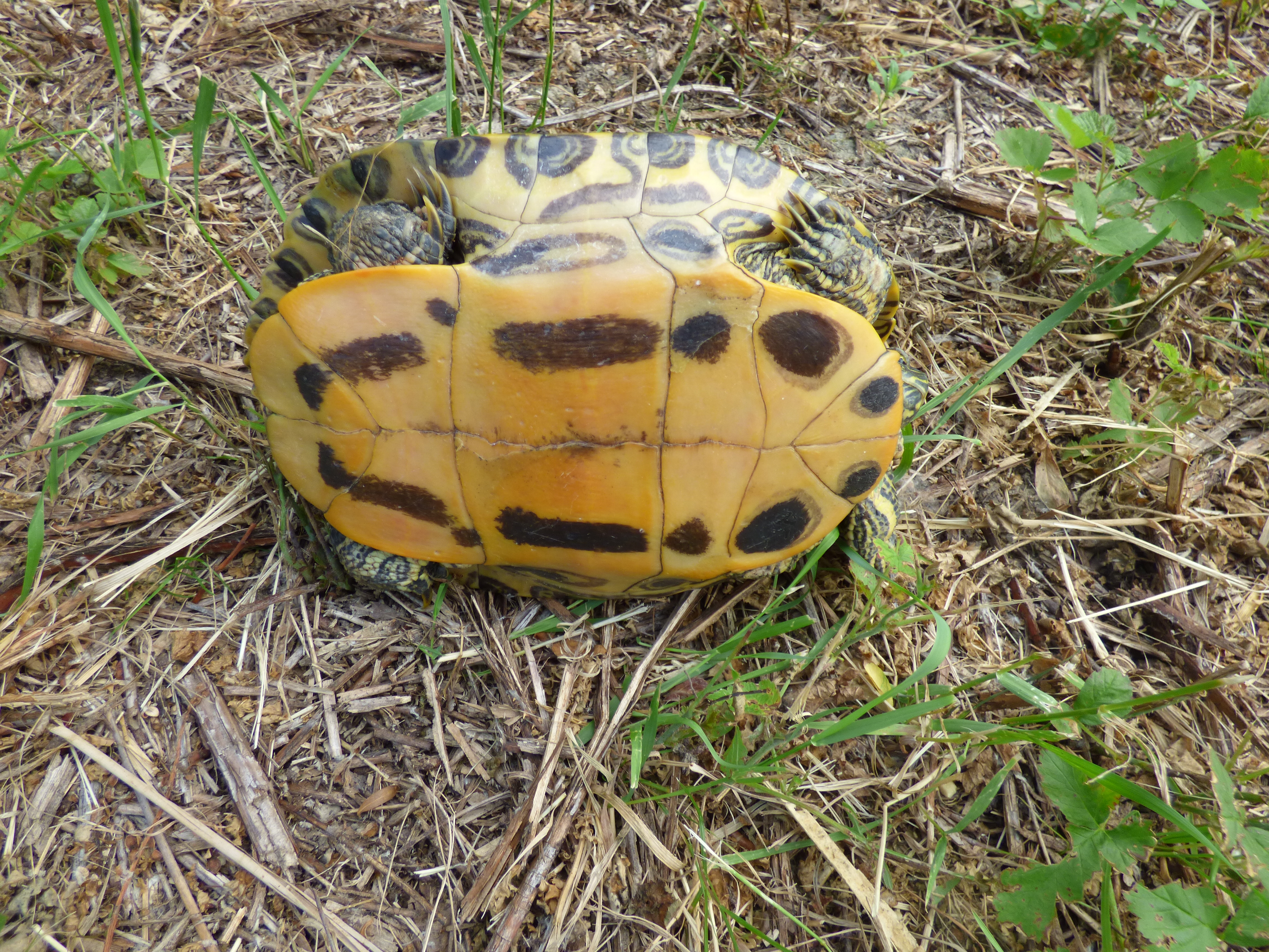 Beim Spaziergang in unserem Kleinen Wald komme ich zu einem Geländestreifen, der erst jüngst gemäht und gemulcht wurde, damit Brombeerbüsche nicht alle anderen Pflanzen überwuchern. Auf diesem Geländestreifen entdecke ich eine Rotwangenschildkröte, die, gemächlich wandernd, sich immer weiter von dem Weiher entfernt, in dem recht viele ihrer Artgenossen leben. Ich nehme die Schildkröte hoch und erkenne an der vollkommen planen Unterseite des Panzers, dass es ein weibliches Tier ist. Vermutlich ist es auf der Suche nach einem geeigneten Eiablegeplatz. Nachdem ich die Schildkröte wieder abgesetzt habe, streckt sie nach einer Weile den Kopf aus ihrem Panzer und setzt sich ohne Hast wandernd in Bewegung. Ich entferne mich zwar in die entgegengesetzte Richtung, kehre aber nach 45 Minuten zur gleichen Stelle zurück und entdecke nach kurzer Suche die Schildkröte wieder. Inzwischen hat sie mit den scharfen Krallen ihrer Hinterbeine eine Grube in das durch die Sonnenwärme sehr harte Erdreich gescharrt. Den harten Boden hat sie mit Wasser so angefeuchtet, dass eine kleine Schlammpfütze entstanden ist, die das Graben erleichtert. Das Wasser hierfür hat sie in ihrem Analsack, mit dem die Natur die Schildkröten ausgestattet hat, mitgebracht.  Um nicht weiter zu stören, entferne ich mich. Der gewählte Eiablegeplatz erscheint mir allerdings nicht geeignet, denn die wachstumsfreudigen Brombeeren werden bald wieder austreiben und somit die Sonne an der nötigen Erwärmung des Brutplatzes hindern. Die Rotwangenschildkröten sind in den mittleren und östlichen Nordamerika beheimatet. Sie wurden durch den Tierhandel  als Schmuckschildkröten nach Europa  eingeführt und an Tierfreunde verkauft. Vielen dieser Tierfreunde wurden diese Schildkröten irgendwann lästig und sie gaben ihnen, vielleicht sogar in guter Absicht, die Freiheit, indem sie die Reptilien einfach in unsere heimischen Gewässer aussetzten. Mittlerweile gibt es bei uns kaum ein Stillgewässer, das frei von Rotwangenschildkröten ist. Diese Fremdlinge stehen in Deutschland nicht unter Artenschutz. Sie werden als Verfälschung und Gefährdung unserer heimischen Fauna eingestuft, da sie der heimischen Europäischen Sumpfschildkröte den Lebensraum nehmen und Krankheiten übertragen können, gegen die unsere heimische Art keine Widerstandskräfte hat.