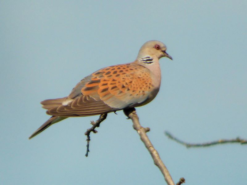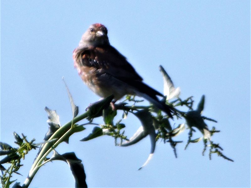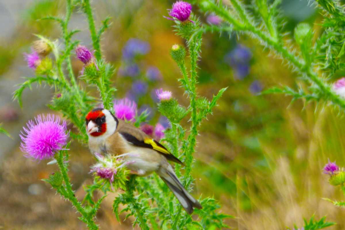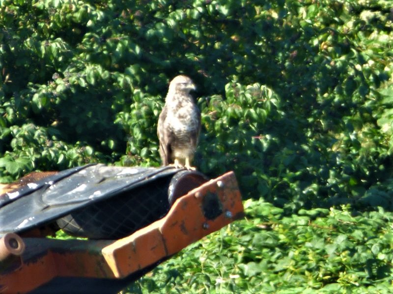 Am Montagmorgen bei gutem Licht und Sonnenschein, fahre ich zur Sandgrube Gerolsheim. Dort angekommen, höre ich sogleich die prüt-prüt – Rufe der Bienenfresser sowie des tiefe turr-turr – Gegurre der Turteltauben. Am Ostrand der Sandgrube stelle ich mein Spektiv auf und mache es mir bequem. Sowohl einzelne als auch kleinere Trupps der bunten Vögel fliegen rufend umher. Die Brut- und Aufzuchtzeit der Bienenfresser scheint vorbei zu sein, denn in den zwei Stunden Beobachtungszeit habe ich keine Futterübergabe an Jungvögel beobachtet. Erjagte Beute wird vom Jäger selbst verzehrt. Mir fällt auf, dass die Bienenfresser sich zur Rast stets so setzen, dass sie immer etwas Sichtdeckung haben. In der Balzzeit konnte ich oft freisitzende Exemplare beobachten. Hat noch jemand diese Beobachtung gemacht und kann das eventuell bestätigen? Ein Mäusebussard hat sich ein Transportband als Ansitz erkoren und schaut geduldig nach Beute aus. Selbst als zwei weitere Bussarde rufend über das Grubengelände kreisen, schaut er nur interessiert nach oben. Uferschwalben fliegen pfeilgeschwind an mir vorbei. Einige Blau- und Kohlmeisen steuern immer wieder Bruthöhlen der Bienenfresser an und schlüpfen kurz in die Höhlen. Ob sie dort wohl Insekten finden? Auffallend viele Bluthänflinge fliegen im Schwarm, dem sich auch einige Stieglitze angeschlossen haben, durch das Grubengelände. Dabei lässt sich der Vogelschwarm bevorzugt an Disteln nieder, um deren Samenstände zu plündern. Leider gelingen mir keine vorzeigbaren Bilder der Bluthänflinge, da die Entfernung zwischen mir und den kleinen Vögeln zu groß ist. Nur ein besonders zutraulicher Stieglitz nähert sich mir. Auf der schilfbestandenen Wasserfläche schwimmen einige streitlustige Blesshühner. Beim Verlassen meines Beobachtungspostens fällt mir ein fliegender leuchtend roter Schmetterling auf. Nachdem sich dieser an eine Distelblüte setzt, kann ich den Falter als Russischer Bär bestimmen. Allerdings verdecken seine schwarzweißen Vorderflügel nun die leuchtend roten Hinterflügel. Sollte der Russische Bär Eier ablegen wollen, so wachsen hier genug Brennnesseln und Brombeeren, und seinen Raupen wird es nicht an Futter mangeln.