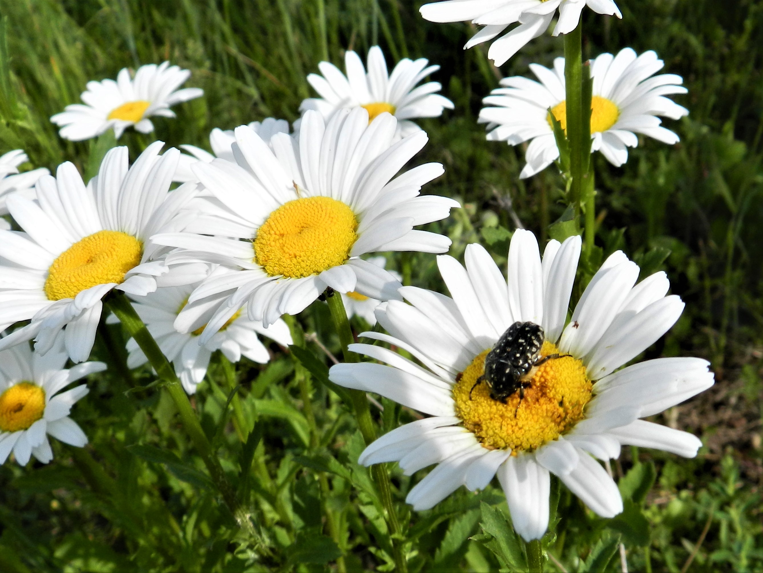 An den Verbindungsweg zwischen der Schraderstraße und der Julius- Bettinger-Straße blühen zur Zeit zahlreiche Margariten (Leucanthemum) vulgare). Da seit einigen Jahren allgemein ein starker Rückgang unserer Insektenpopulation festgestellt wird, schaute ich am Sonntag dem 29. April bei einem Spaziergang nach, wie viele Insekten die Blüten besuchen, um dort Nektar zu tanken. Unter einigen Zweiflüglern, Hautflüglern, Käfern und Schrecken entdecke ich eine Käferart, die mir völlig unbekannt war. Die metallisch schimmernden Deckflügel sowie die Gestallt des Käfers erinnerten mich irgendwie an die eines Rosenkäfers.. Dieser Käfer war aber nur halb so groß wie der Gemeine Rosenkäfer (Cetonia aurata). Bei Wikipedia wurde ich im Internet schnell fündig und konnte dort über meinen Fund lesen: