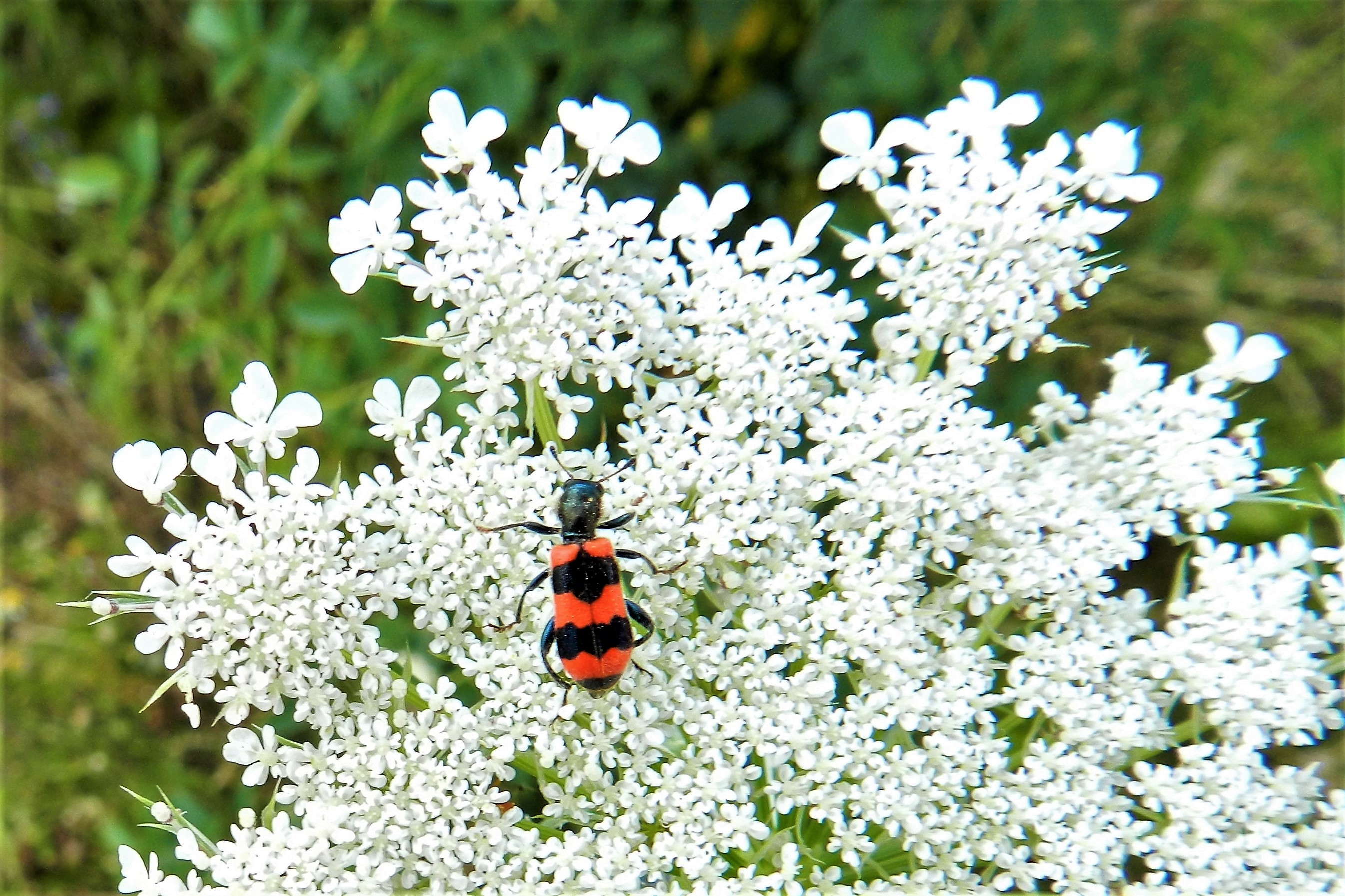 – wohl wegen des nicht mehr zu übersehenden Rückgangs der Insektenvielfalt- ein Umdenken eingesetzt, und ich konnte eine erstaunliche Zunahme an Wildblumen und Insekten registrieren. Auf dem weißen schirmartigen Blütenstand einer Wilden Möhre (Daucus carota) entdeckte ich den Gemeinen Bienenwolf (Trichodes apiarius), der zu der Familie der Buntkäfer gehört. Obwohl dieser Käfer nur 15mm Körperlänge hat, ist er dank seiner auffälligen Färbung kaum zu übersehen. Vor allem die roten Flügeldecken mit den schwarz-violetten welligen Querbinden sind sehr auffällig. Kopf, Halsschild und Beine glänzen blauschwarz. Die Fühlerenden sind keulenartig verdickt. Der Bienenwolf besucht gerne die Blüten schirmblütiger Pflanzen, um dort kleinere Insekten zu jagen, die von den Blütenpollen naschen. Er selbst verschmäht aber auch die Pollen dieser Blüten nicht. Die Larven des Bienenwolfes leben als ungebetene Gäste in den Nestern von Wild- und Honigbienen. Sie ernähren sich dort von den Larven und Puppen der Bienen. So weit ich weiß, ist es nicht bekannt, ob die Honigbienen durch die Larven des Bienenwolfes ernsthaft Schaden nehmen. Da er bei uns sehr selten ist, wird sich die Schädlichkeit (so meine Vermutung) für die Honigbienen wohl in erträglichen Grenzen halten. Für diesbezügliche aufklärende Zuschriften oder Hinweise wäre ich dankbar. Ein besonderer Schutzstatus ist nach den Naturschutzgesetzen für den Bienenwolf bisher nicht vorgesehen.