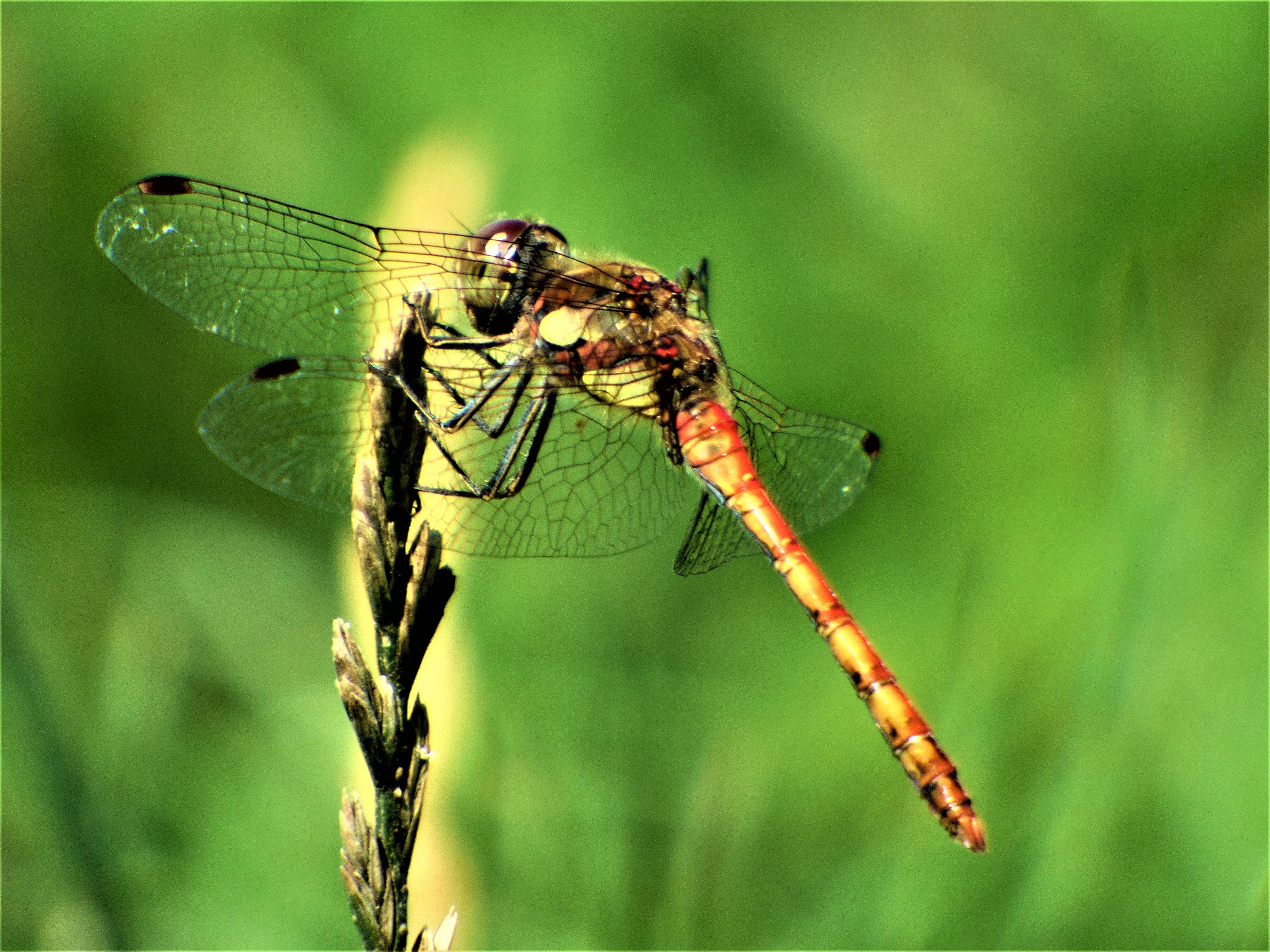Sehr häufig sahen wir die auffällig rot gefärbte ,,Heidelibelle“. Sie hat schwarze Beine mit gelben Streifen. An jedem Flügelende ist ein schwarzer Fleck zu sehen. Eine genaue Artbestimmung kann ich nicht abgeben. Wir finden die Libelle dennoch wunderschön. Einige Schrecken, die ich leider auch nicht bestimmen kann, waren in Paarungsstimmung oder knabberten genüsslich an den Blättern des Vogelknöterichs.