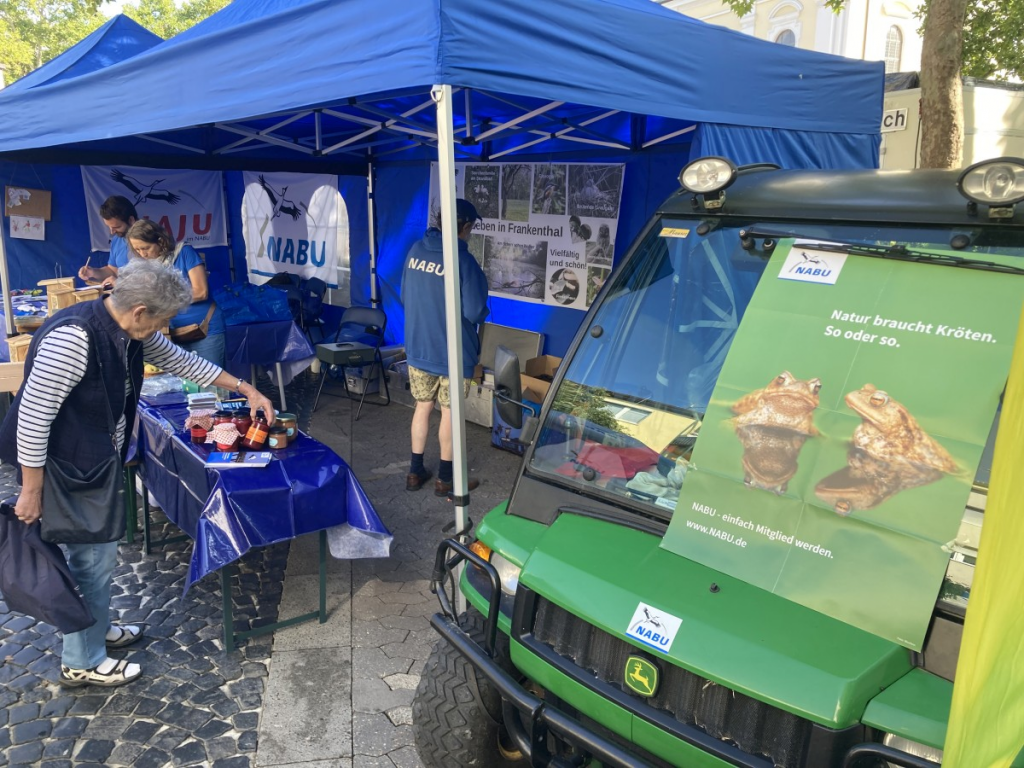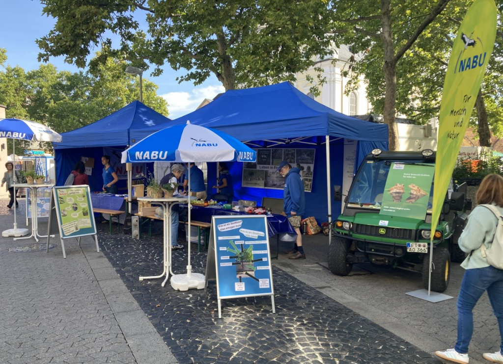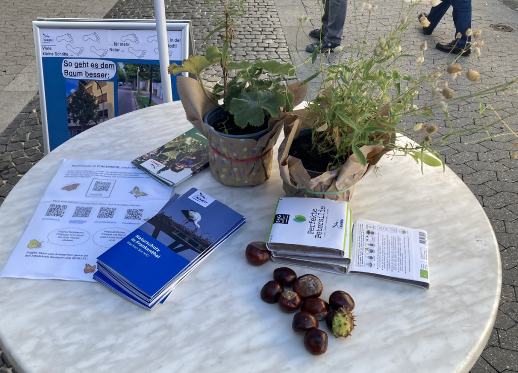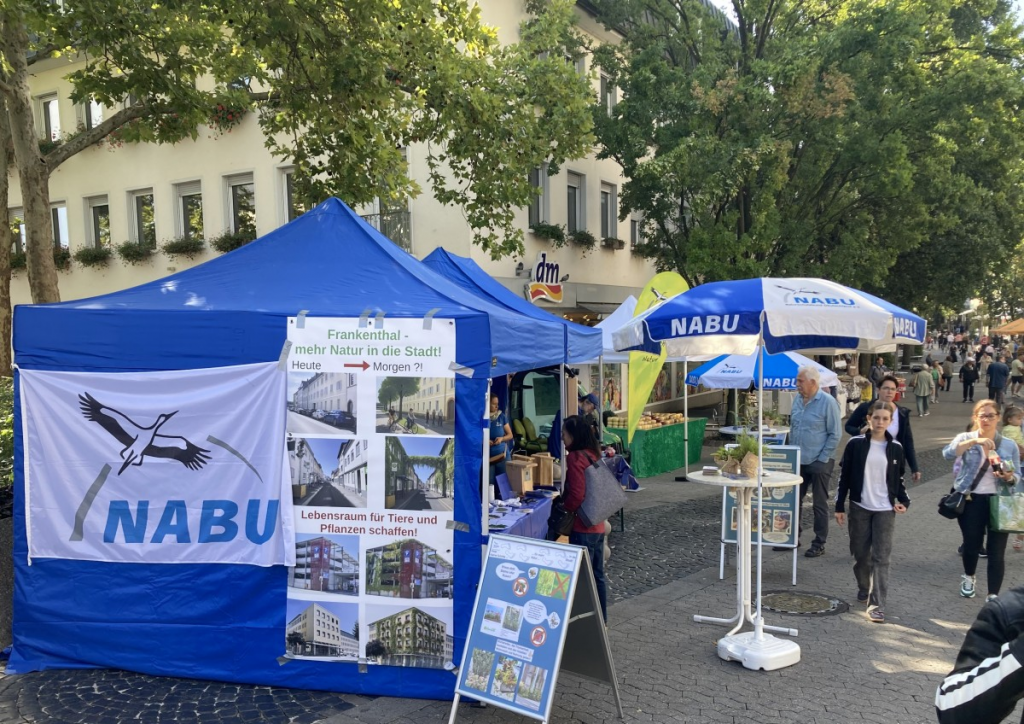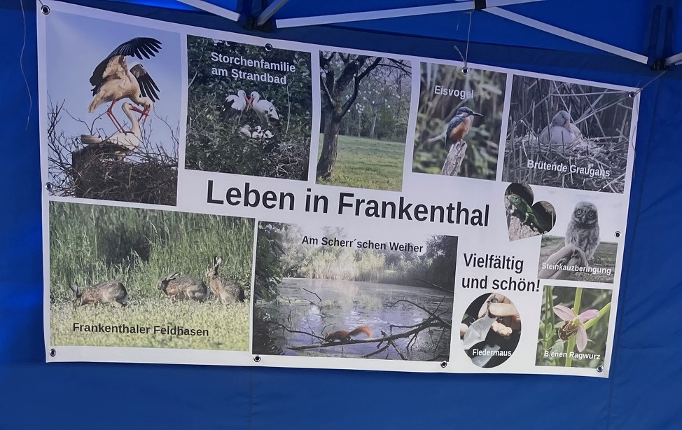 Das Thema Stadtklima/Stadtgrün ist für uns und für die Stadt top aktuell und wird zurzeit vielfältig diskutiert. Dazu wollten wir dieses Mal unbedingt einige zentrale Ideen in ansprechender und unübersehbarer Form an unserem Stand präsentieren. Melanie hatte deshalb zwei große Foto-Banner entworfen und organisiert und auch die Gehwegaufsteller neu bestückt, und zwar mit großen Bildern und Texten zum Thema. Nachdem wir auf dem Stand zum ersten Mal das Ergebnis in Originalgröße begutachten konnten, waren wir alle sehr angetan. Das eine Banner hat die Überschrift „Leben in Frankenthal – Vielfältig und schön!“ und zeigt Fotos von der interessanten Tier- und Pflanzenwelt in und um Frankenthal. Das andere Banner hat die Überschrift „Frankenthal – mehr Natur in die Stadt“ und stellt Fotos gegenüber von aktuellen eher lebensfeindlichen Frankenthaler Straßen und den gleichen Straßen nach einer Begrünung (von Manfred Computer-modelliert) durch Bäume und Pflanzen, die die Aufenthaltsqualität für Mensch und Tier offensichtlich stark verbessern. Unsere großformatigen Info-Mittel waren echte Hingucker und haben sicher dazu beigetragen, dass die RHEINPFALZ danach auch berichtete „… der NABU informiert über Tierwelt und Bäume und zeigt Begrünungskonzepte …“.