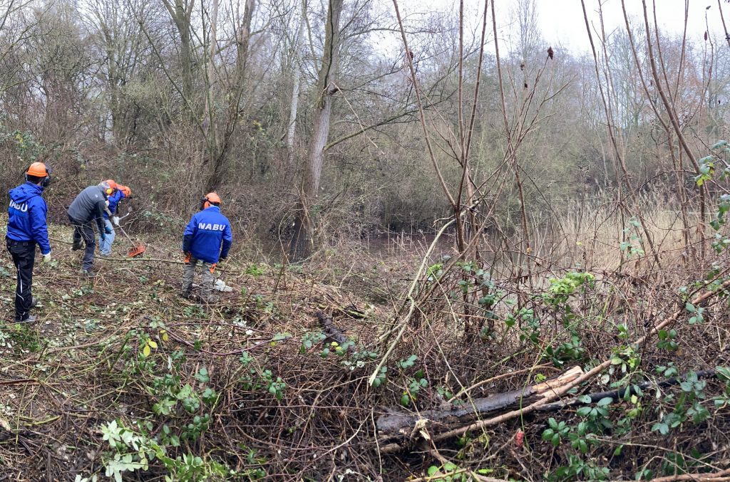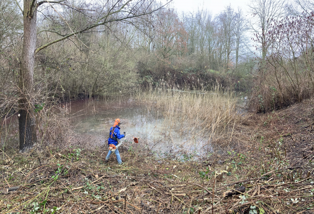 Letzten Samstag sind wir endlich wieder dazu gekommen, das Gelände um den kleinen, ziemlich zugewachsenen Weiher, unseren „Nabu-Weiher“, im Kleinen Wald zu pflegen. Er hatte und hat es auch nötig, so zugewachsen wie er am Ufer ist. Mit Kettensäge und Freischneidern haben wir uns Zugang verschafft und auf einer Seite des Ufers den Bewuchs zurückgeschnitten.