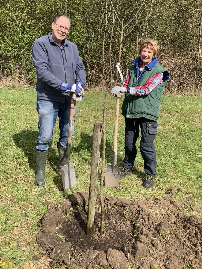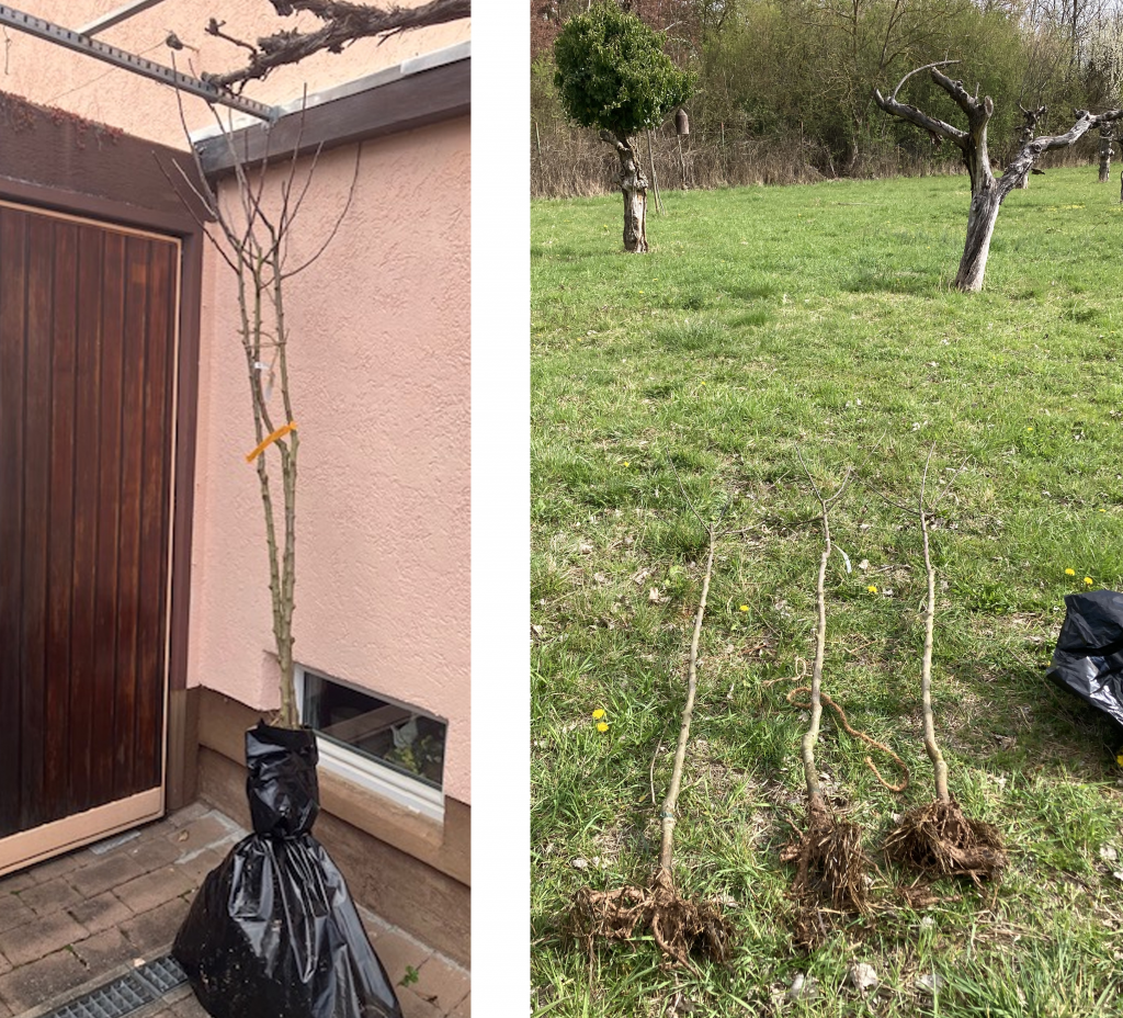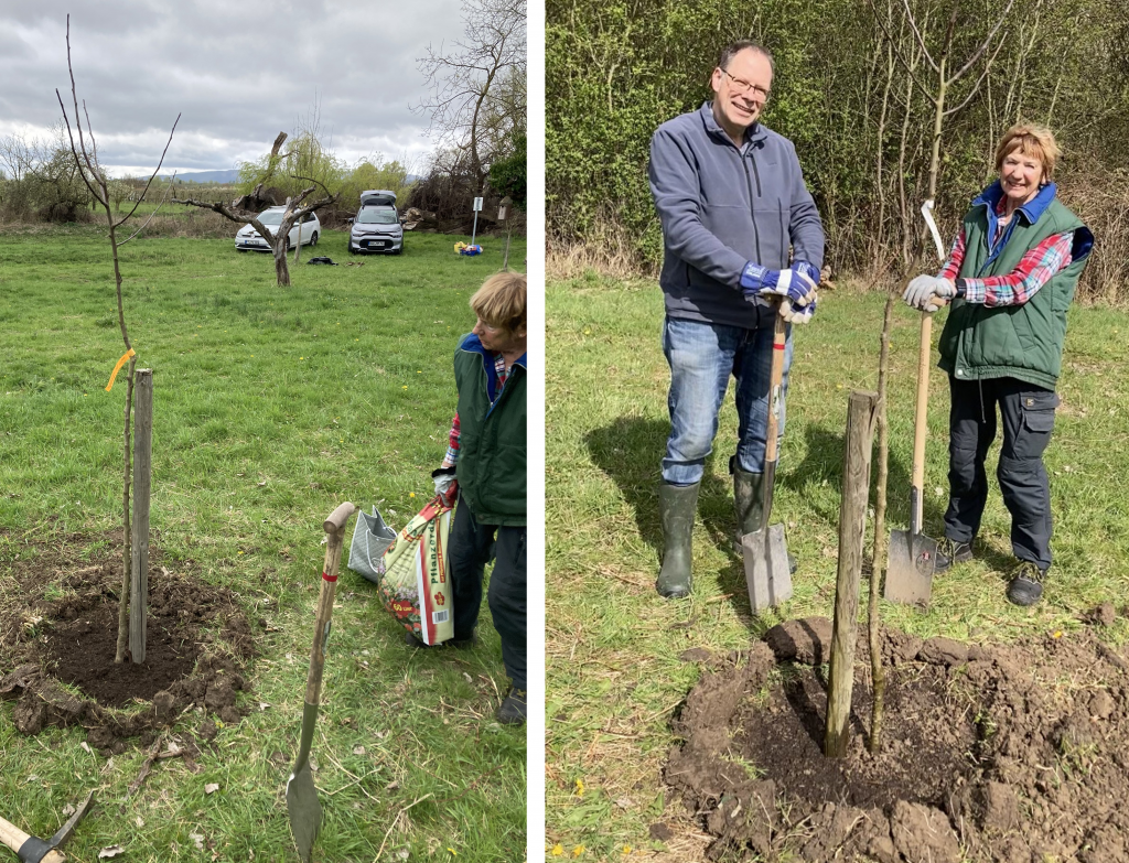 Gestern, am Samstag den 04.04.2026, haben Monika und ich eine Pflanzaktion auf unserem Grundstück bei Freinsheim, unserer „Apfelwiese“ durchgezogen. Wir haben drei Apfelbäumchen gesetzt, und zwar von einer alten gebietstypischen Sorte mit dem schönen Namen „Pfälzer Schafsnase“. Der Malus „Pfälzer Schafnase“, oder auch „Gelbe Schafnase“, ist laut Baumschule (Ritthaler) „ein großer, saftiger Herbst- und Winterapfel (Oktober bis Januar), knackig-saftig, sehr groß, gelbgrün-hellgelb, reichtragend, starkwüchsig und robust“ und erscheint uns damit sehr gut für unsere Streuobstwiese geeignet. Bis zur ersten Ernte von diesen Bäumchen wird es aber wohl noch ein paar Jährchen dauern.
