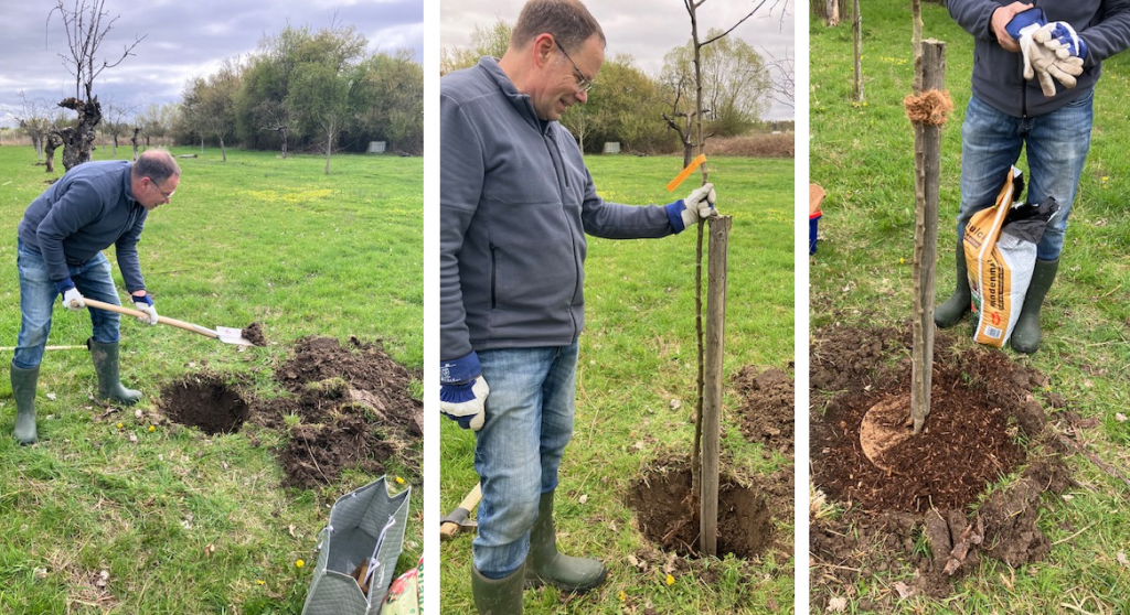 Wir haben drei Pflanz-Löcher ausgehoben (in der Flucht mit den vorhandenen Bäumen und mit ausreichend Abstand), jeweils einen Stützpfahl eingeschlagen, in das Loch die Wurzeln des Setzlings eingesetzt und mit einer Mischung aus Pflanzerde und der ausgegrabenen, sehr fetten, ton-haltigen Erde gemischt, das ganze mit den Füßen festgetreten, mit einer Baumscheiben-Abdeckung und mit Rindenmulch bedeckt und einen Gießring um die Baumscheibe angelegt: