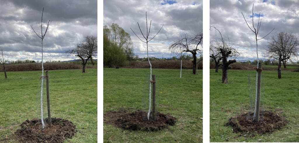 Dann ging es weiter mit reichlich Wässern, die Bäumchen mit Weißanstrich schützen, anbinden und mit Verbiss-Schutz einwickeln. Schon fertig! So sahen die drei Bäumchen zum Schluss aus: