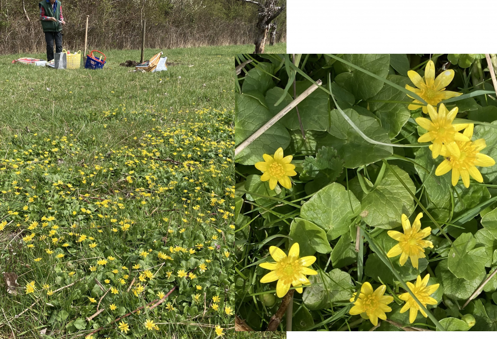 Es blüht schon sehr hübsch auf der Wiese. Die vielen kleinen gelben Blümchen kennt meine App als Scharbockskraut (Ranunculus ficaria):
