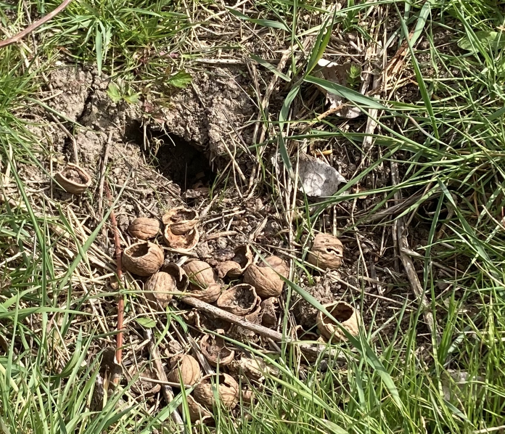 Dann haben wir noch dieses Mauseloch entdeckt, mit vielen leer-gefutterten Walnussschalen davor: