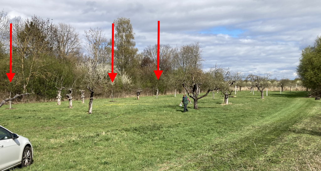 Zum Schluss nochmal ein Überblick über die Apfelwiese. Die Pfeile zeigen die Lage der drei neuen Bäumchen. Bei einer Reihe von weiteren Bäumen haben wir zum Schluss auch noch den Weiß-Anstrich erneut. Wir fanden, dass die Wiese ingesamt gut dasteht, und freuen uns jetzt auf unser geplantes „Apfelblütenfest“ dort in drei Wochen.
