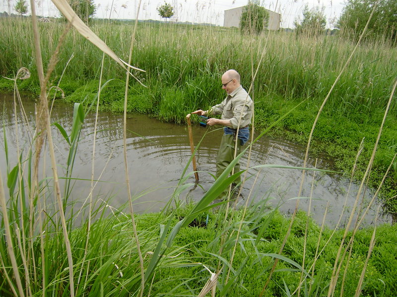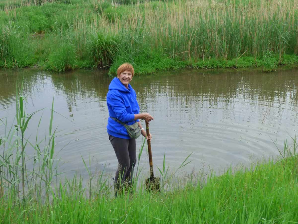 Hermann, der Initiator und Spender der 30 Wasserpflanzen führte uns ins renaturierte Isenachgebiet in Mörsch. Dort haben wir mit Spaten, Gummistiefen und Wathose ausgerüstet – innerhalb einer Stunde die rosablühende Schwanenblume – auch fälschlicherweise Blumenbinse genannt – in die Erde im Wasser gebracht.