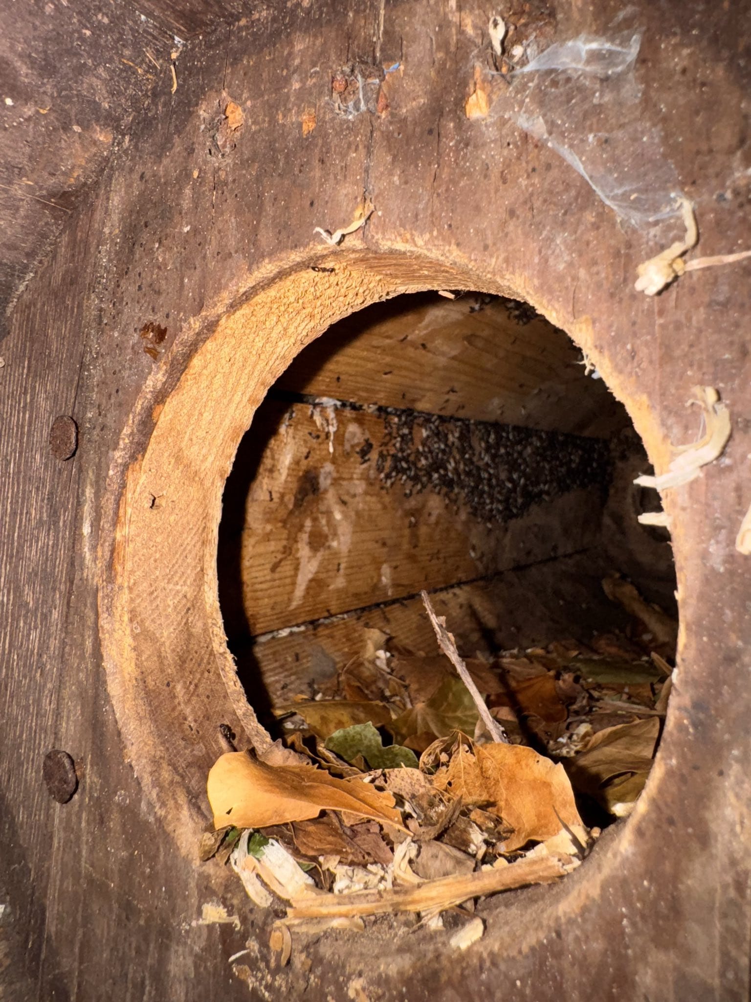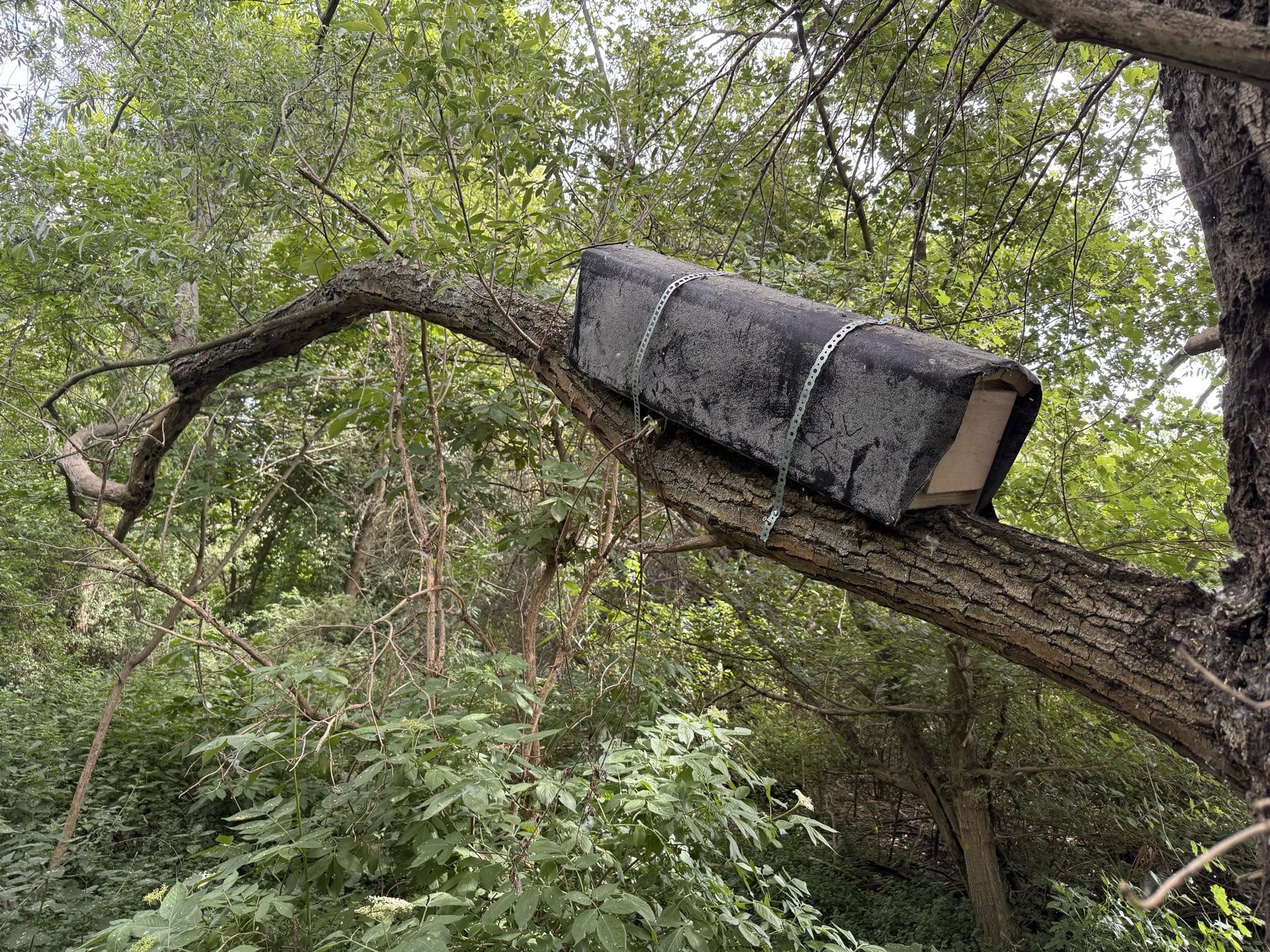 Unsere erste Röhre, die wir heute angefahren haben, hing leider schräg nach unten am Baum. Zum Glück hatten wir eine neue Röhre dabei, da wir dort noch eine weitere anbringen wollten. Nachdem wir die neue Röhre befestigt hatten, haben wir die alte Röhre in der Nähe in einer Baumgabelung abgelegt. So hat das Männchen dort nun einen eigenen Platz oder vielleicht zieht auch der Star ein (siehe Bild).