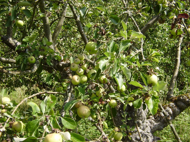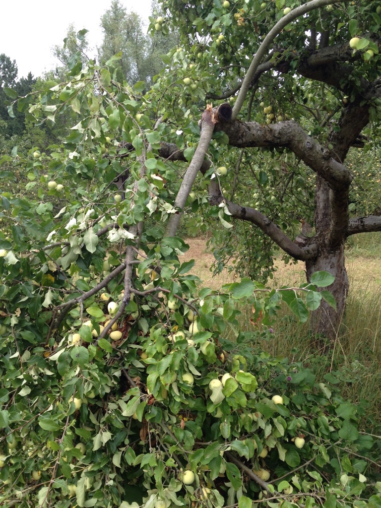 Diese Woche war es soweit: Unser Helfer in Sachen Mahd ist mit seinem John Deere Traktor über die Pflaumenwiese und Apfelwiese gefahren. Mann, hat das gestaubt, sooo trocken. Das Gras stand mir bis zur Nase – so hoch. Auf den Bildern sieht man vorher – nachher Effekt: Jetzt sieht es wie eine schöne Parklandschaft aus mit ein paar Blumeninseln, die für die Schmetterlinge stehen geblieben sind. Übrigens- die Äpfel sind recht klein – zu grosse Trockenheit diesen Sommer, dafür sind es viele. Sogar die Klaräpfel tragen reichlich und wollen schon geerntet werden.