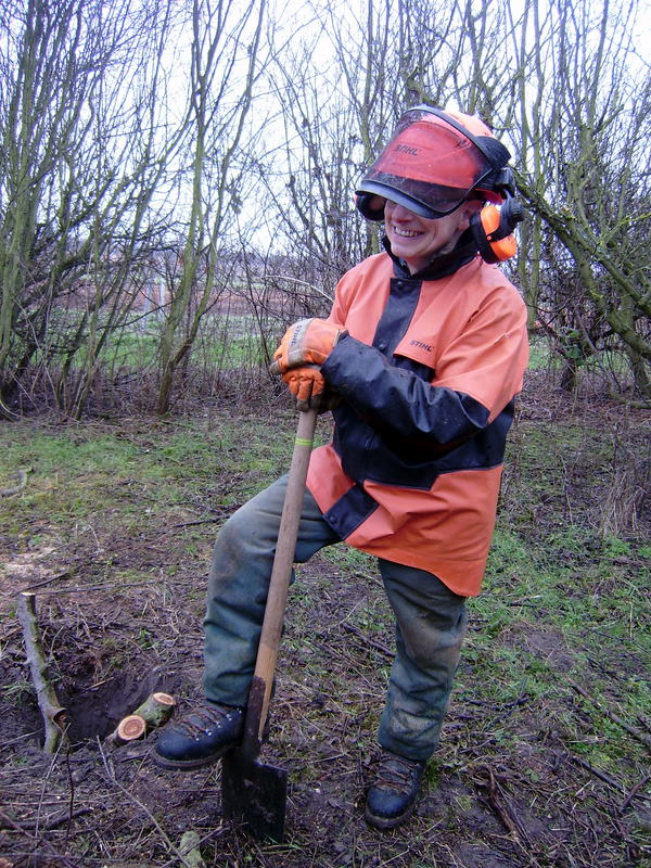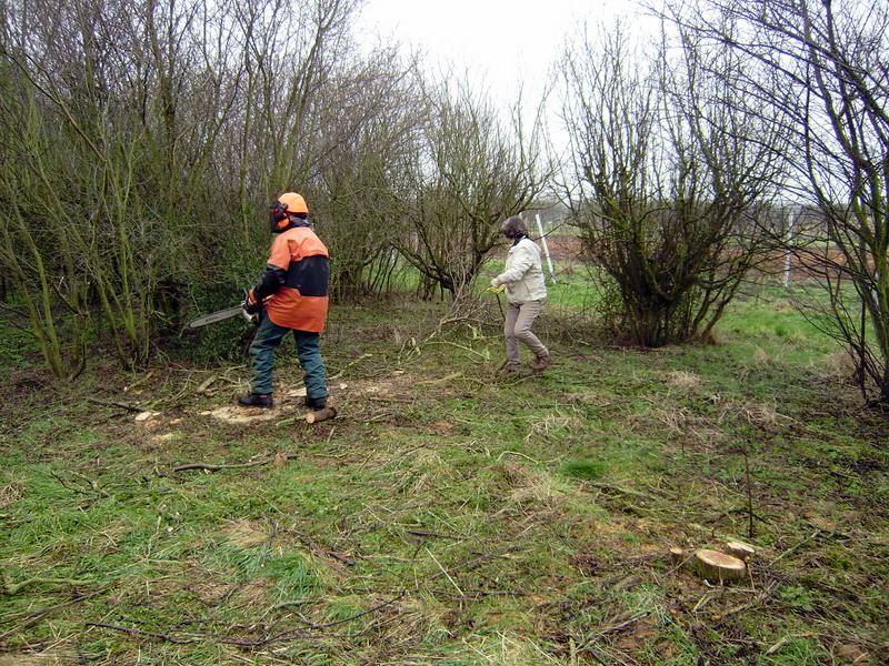 An unserer heutigen Pflegeaktion haben nur drei NABU-Leute teilgenommen: Manfred als Hauptakteur mit Kettensäge und Monika und Evelyn. Dabei kam der Freischneider gar nicht zum Einsatz, sondern die zwei Damen betätigten sich als Ästeaufsammler und Heckenbauer. Manfred hat heftig gesägt um im Dickicht eine Lichtung zu schaffen für unsere neu zu pflanzenden Bäume. Das erwies sich als schwerer und längere Zeit in Anspruch nehmend als gedacht. ..Waren ja auch nur zu dritt!!