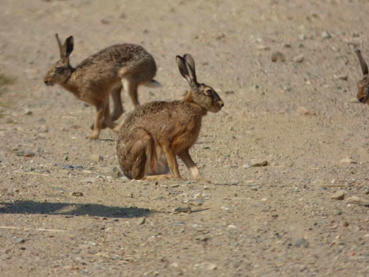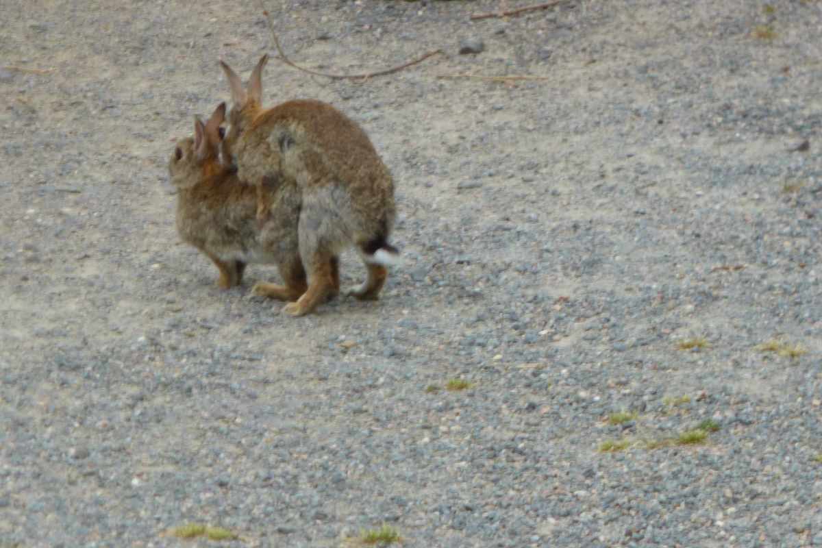 Von unserem Balkon aus können wir das lebhafte Treiben der Wildkaninchen beobachten. Nahrungsaufnahme, Rangkämpfe, Paarung, Säugung des Nachwuchses, aber auch die Verfolgung durch Beutegreifer erleben wir mit. Am liebsten würden wir eingreifen, wenn wieder einmal eine Katze, oft nach stundenlangem Ansitz, ein niedliches junges zappelndes Kaninchenkind im Maul davonträgt. Weitere Fressfeinde wie Fuchs, Marder, Iltis, Hund oder Habicht, stellen zwar auch den Kaninchen nach, doch konnten wir sie hier bei uns im Stadtgebiet noch nicht bei einer erfolgreichen Jagd beobachten.